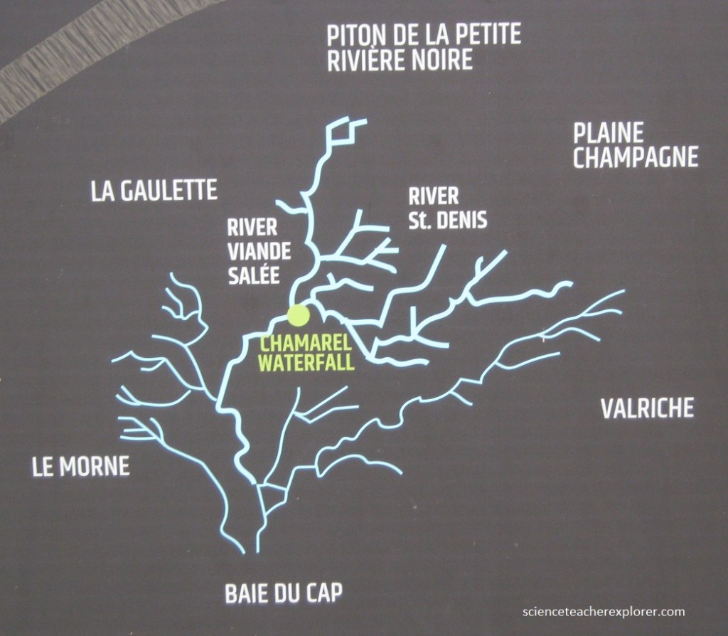 Pictured below, there are several good vantage points to see the nearby Cascade Chamarel, (Chamarel Waterfall) plunging down a high cliff face into the Riviere du Cap. With it’s 100m drop, Chamarel Waterfall is the highest in Mauritius. It is fed by two rivers, the St. Denis and Viande Salee. It’s water then descends into one of the Baie du Cap River’s catchment areas. The flow ranges from 22,500m3-41,000m3.