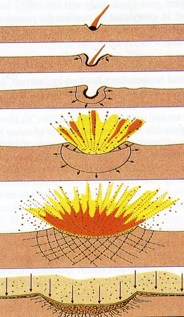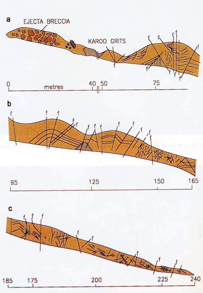 The mid-section of the rim consists of buckled or folded granite. This fold has been locally fractured and displaced along some small-scale faults. This folded structure, also known as an anticline, is clearly exhibited along the road entering the crater. Folds, like this one, result from initial outward motion: the granite is first driven outwards in a horizontal direction and then deflected upwards towards the surface, (pictured below).