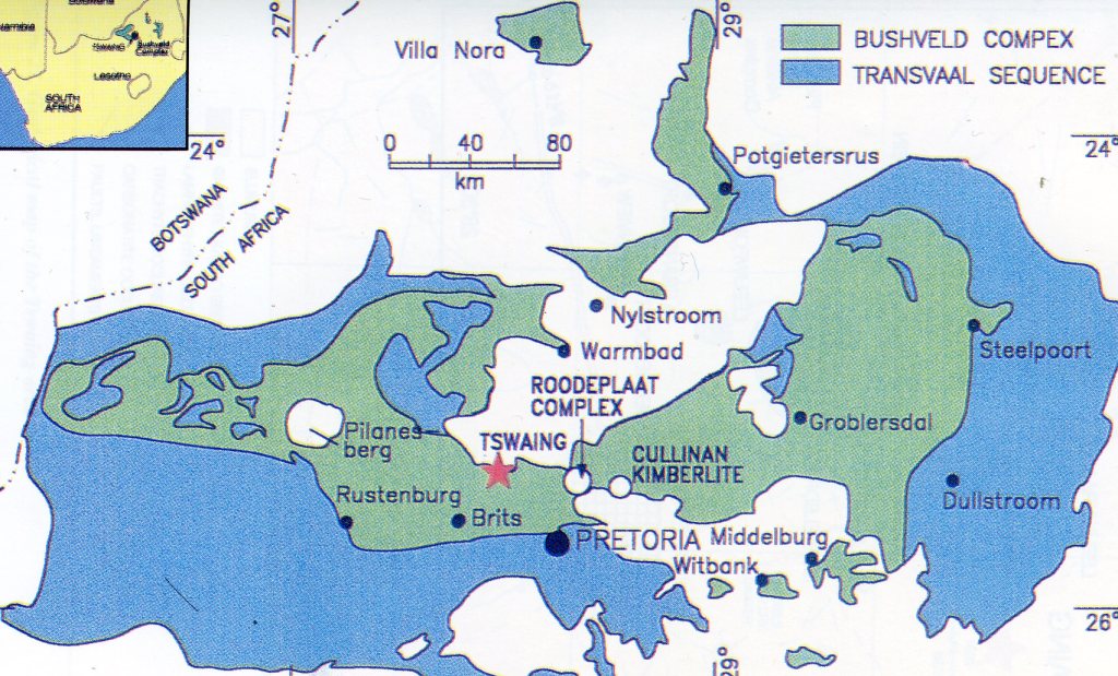 The Bushveld Complex is very important in its own right. It is a magmatic structure stretching from Pretoria in the southwest to Phalaborwa in the northwest, and from Middelburg in the south to Potgietersrus in the north. It contains a fill of several kilometers of magmatic rocks which form a sequence of near-horizontally layered rock types. The Bushveld Complex hosts some of the world’s most important ore reserves, including much of the world’s chromium, vanadium, platinum, silver, and tin.