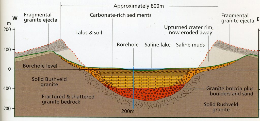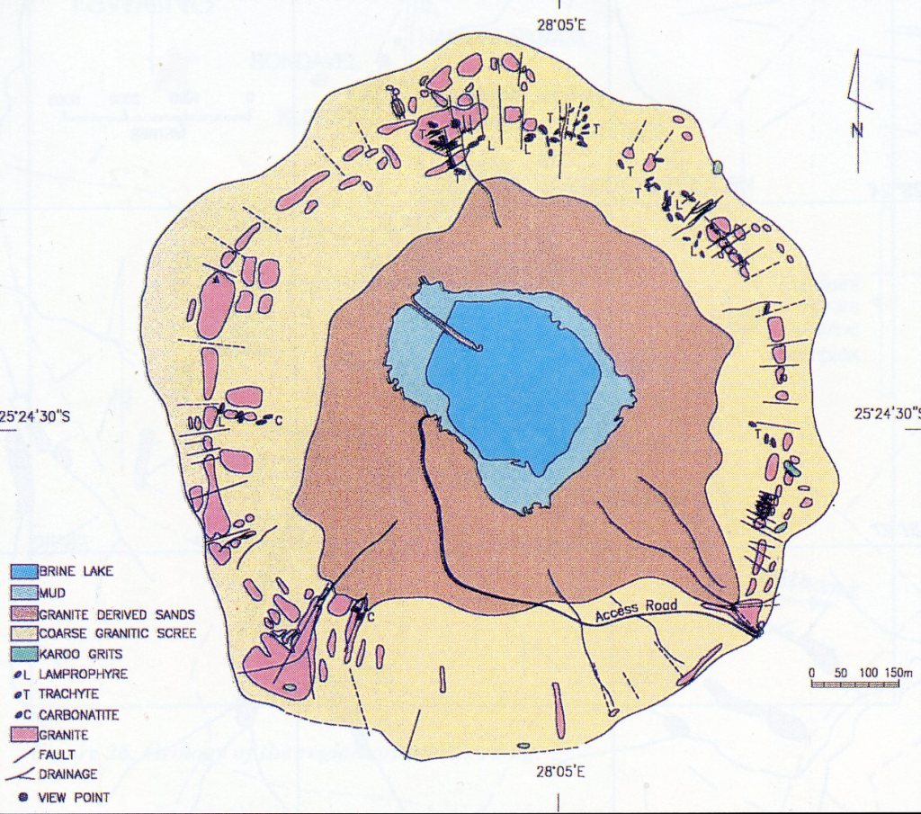 However, the rocks forming this ring are granite, a deep-seated intrusive rock approximately three million years old, and not volcanic rock that has erupted at the surface. This crater is unique in South Africa: the central floor lies about 60 meters below the level of the surrounding land surface, and underlying the soda lake area variety of fine-grained muds which contain fragments of rock, some containing magnetite, (an iron oxide).