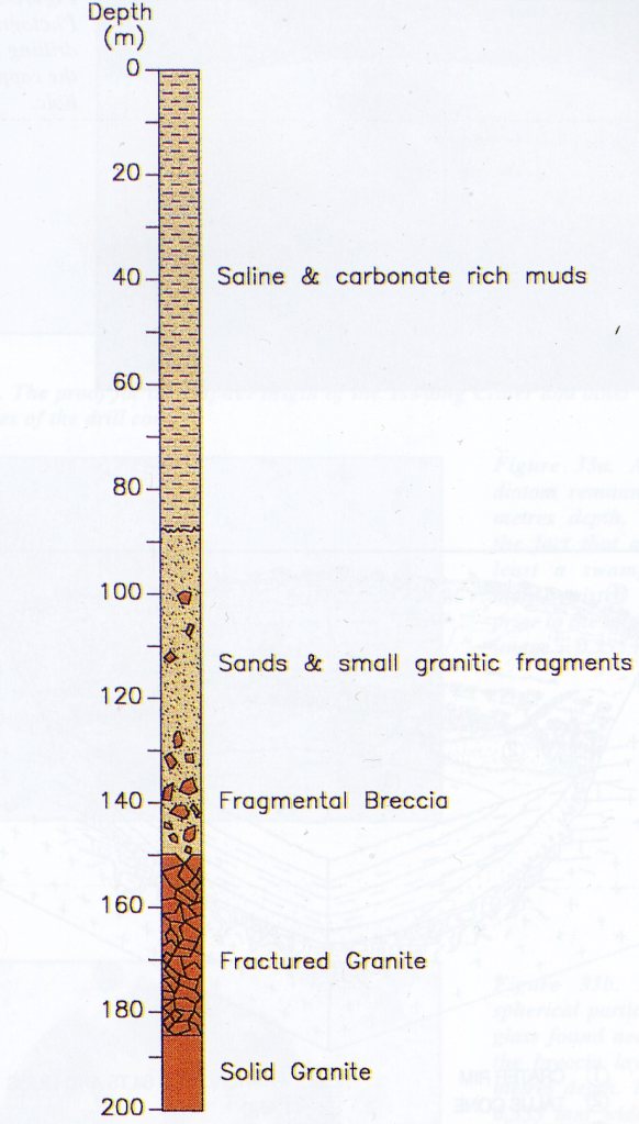 Pictured above, the drill core obtained from this borehole showed about 90 meters of crater-fill sediments overlying tens of meters of loose suevitic material and fragmented granitic rock. The fragmented rock in the drill core passes gradually downwards into less affected and, finally, non-fragmented rock. In the lower portion of the core, below the crater-fill breccia, only blocks separated by fractures were observed. Many diagnostics of shocked metamorphic-effects were observed, (which are uniquely associated with meteorite impact craters, in material recovered between the 90 and 150 meters depth.