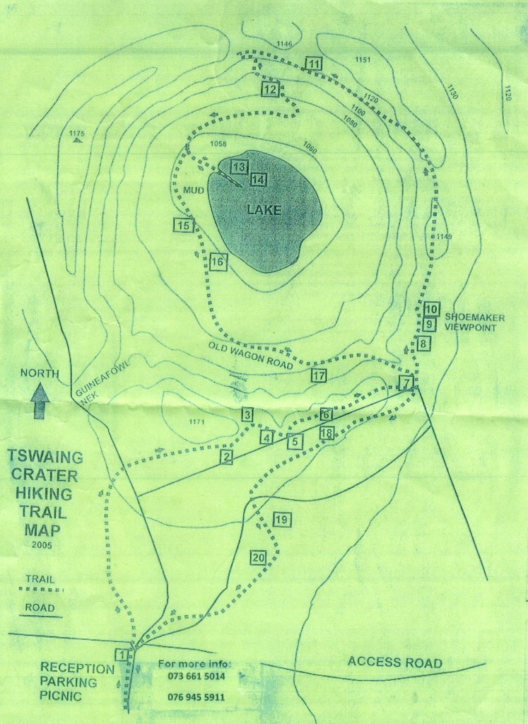 Pictured above, the near-circular Tswaing Crater has a 1.13 km, (from rim to rim) diameter. From this “Shoemaker Viewpoint” the picture is taken 60 m higher than the surrounding landscape and 100 m above the crater floor. The rim is well preserved and consists of a up-tilted granite from the 2.050 million old “Bushveld Complex” or the Nebo Granite.
