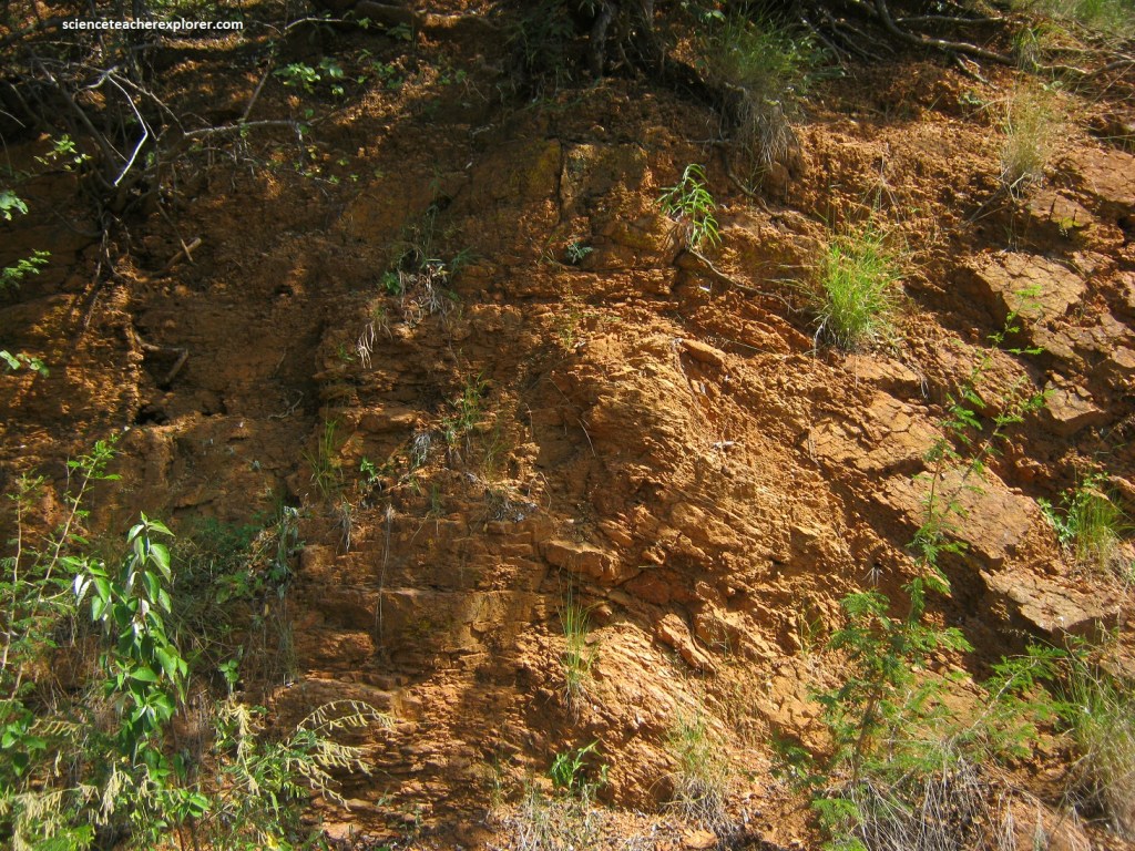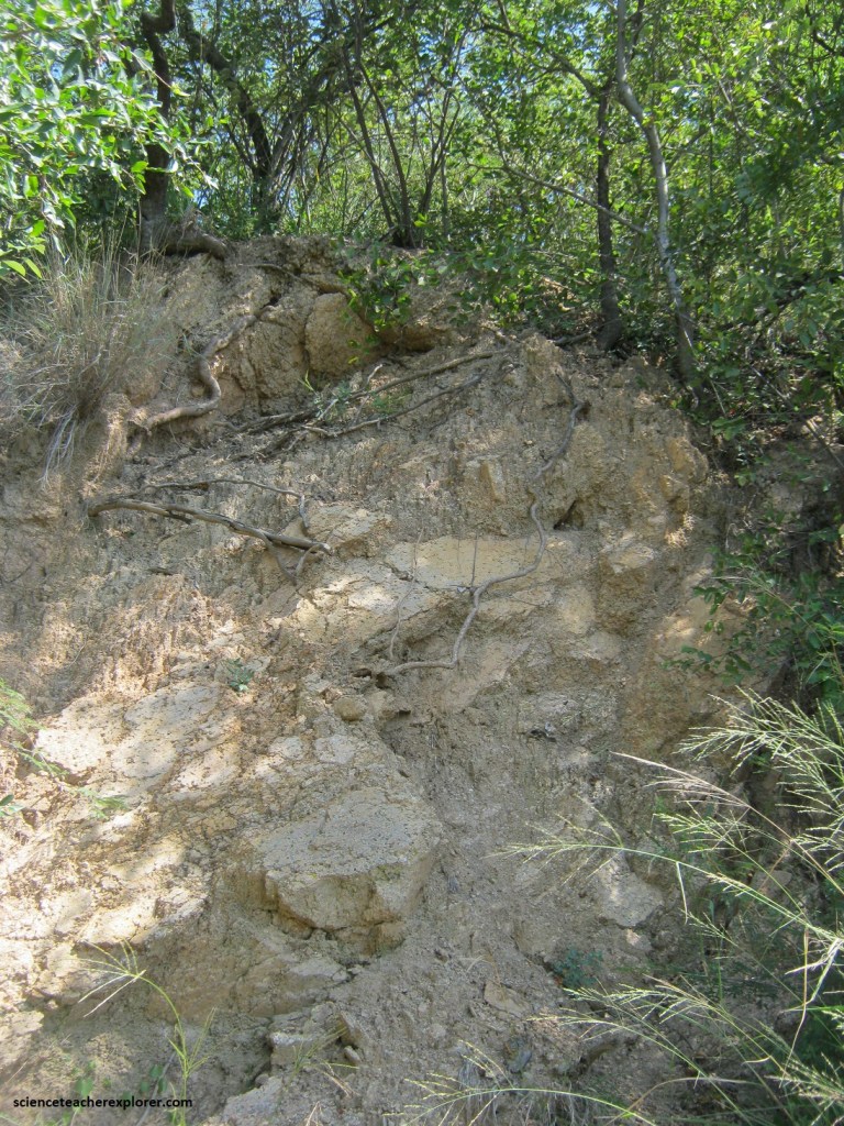 Highly altered granite is also common in the crater and is particularly abundant in parts of the crater rim. It is recognized by its typical whitish to greyish parts of the crater rim. The weathering of rock of the crater rim is the result of surface waters penetrating the granite along fractures and joint planes. The fractures, which are very common in the granite rim, allow easy access for the surface water, (pictured below). At the top of the rim the granite dips outwards at varying degrees, indicating that the rim granite had been tilted upwards. The upper, steepened granite and the Karoo sediments, (younger 220 million year old sedimentary-rocks that are gritty in texture), overlying the granite are also broken by a number of small, nearly vertical, radial faults, which have caused the numerous depressions seen along the rim crest trail.