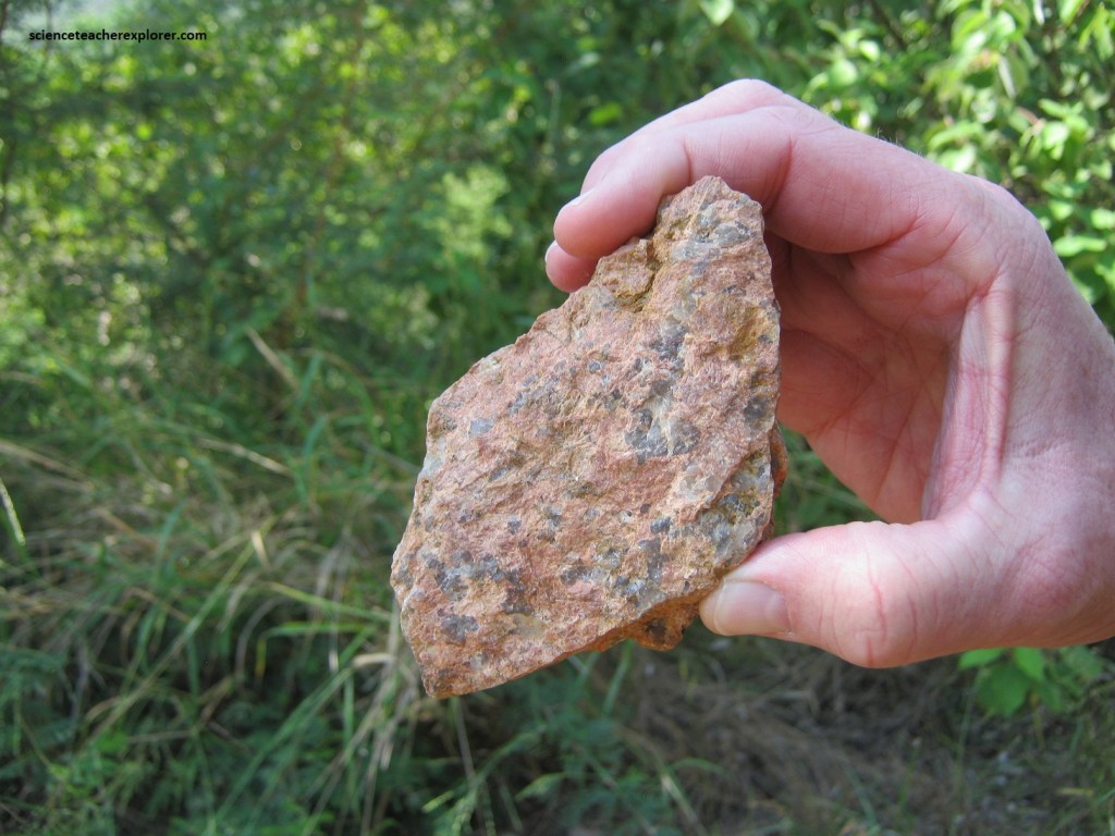 Granite is found on the higher areas of the inner and outer rims of the crater. In hand specimens, the fresh granite appears as a coarse grained, pink rock. The largest grains which are pink or light brown consist of the mineral K-feldspar and are interlocked with large quartz grains of milky white of light-grey appearance. Minor amounts of the minerals hornblende and biotite appear as dark specks, (pictured below).