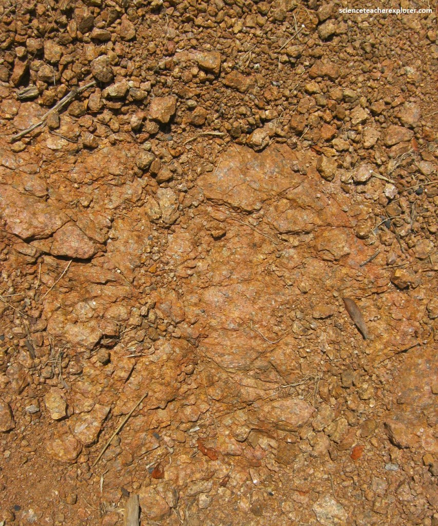 At the crater’s rim, the granite weathers into large, rounded boulders or into smaller, angular, crumbly fragments of feldspar and quartz, (pictured below).