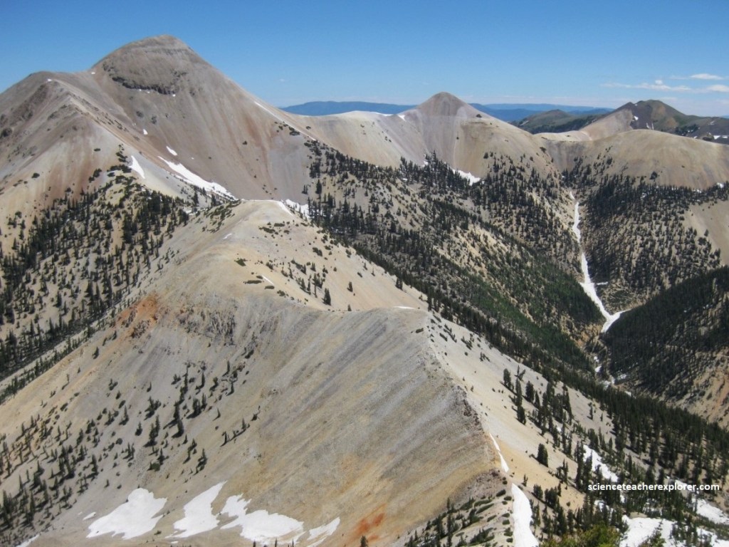 Mount Belknap and Baldy of the Tushars were formed between 22 and 32 million years ago by volcanic activity that included a calamitous explosion that blew off the top of a massive peak leaving these two peaks behind.