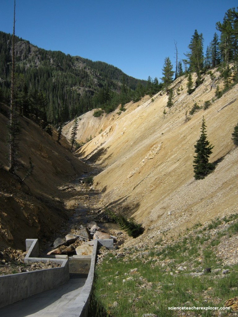 Pictured above, Bullion Canyon is the site of epithermal north-trending gold veins mined at the Bully Boy, Cascade, and Shamrock mines. Discovered in 1868, the ores produced almost $4 million, mostly in gold.