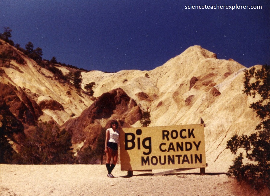 On the northeastern part of the Tusher Range and located a few miles north of Marysvale, Big Rock Candy Mountain consists of altered volcanic rock in various shades of yellow, orange, red, and white, (pictured below). Approximately 22 – 35 million y.a., a cluster of stratovolcanoes erupted, depositing large volumes of lava and ash. Known as the Bullion Canyon Volcanics, these volcanic rocks are more than 1,000 m thick. Approximately 21 million years ago, at least six magma bodies intruded the overlying Bullion Canyon Volcanics. Through a complex chemical process involving hydrogen sulfide, steam, ground water, and oxygen, the original volcanic rock was partially altered or totally replaced. The vivid colors that one sees at Big Rock Candy Mountain are the direct result of this mineralization. The yellow, orange, and red colors are from the presence of iron minerals, such as hematite, and pyrite. The white color is due to the presence of alunite and kaolinite, minerals rich in potassium and Aluminum. Over the past 15 million years, erosion has removed the distinct shapes of the former volcanoes, and within the past several million years has exposed the altered volcanic rocks in Marysvale Canyon along the Sevier River.