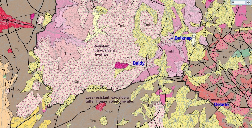 Pictured above, the Joe Lott Tuff erupted as a large avalanche of volcanic ash, rock, and gas. The Joe Lott Tuff is a light tan to pink-brown rock primarily composed of welded ash with quartz and feldspar crystals, glass fragments, and larger fragments of gray pumice and darker volcanic rocks. So much material was effected during the eruption that the roof of the magma chamber collapsed due to the loss of interior support, creating the Mount Belknap caldera, located about 16 km to the southwest.