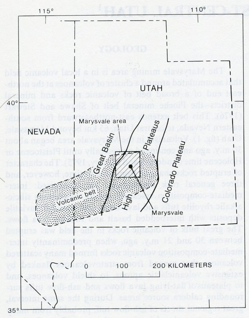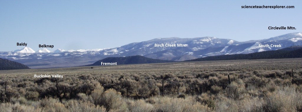 The Tushar Mountains consist of the Bullion Canyon Volcanics from 22-35 million years ago and the Mount Belknap Volcanics from roughly 21 million years ago. The Tushar Mountain area is in a local volcanic field the accumulated around a cluster of volcanoes at the northeast end of a broad belt of volcanic rocks and mineral districts, (the Pioche mineral belt). Imaged below, this belt extends east-northeastward from south-eastern Nevada, to central Utah, 65 km beyond Marysvale, Utah.