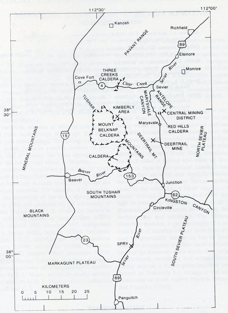 About 21 m.y. ago, the composition of erupted volcanic rock changed abruptly to dominantly silicic-alkalic rhyolite. Between then and 17 m.y. ago, locally voluminous ash-flow tuffs and lava flows were eropted from two source areas near Marysvale, (one in the southern Antelope Range and eastern Tushar Mountains 7-10 km north and northeast of Marysvale), and the other in the Mount Belknap caldera in the central Tushar Mountains.
