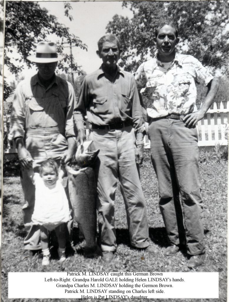 Pictured above, my father was accompanied on the fishing trip by his father, Charles Lindsay, Lewin Limb, and Don Patterson, and the latter actually netted the catch. Pat was using an eight ounce fly rod and a #6 hook which he had tied himself. He was using a 9 pound test leader. The men saw the mammoth trout strike the fly almost the instant it hit the water.