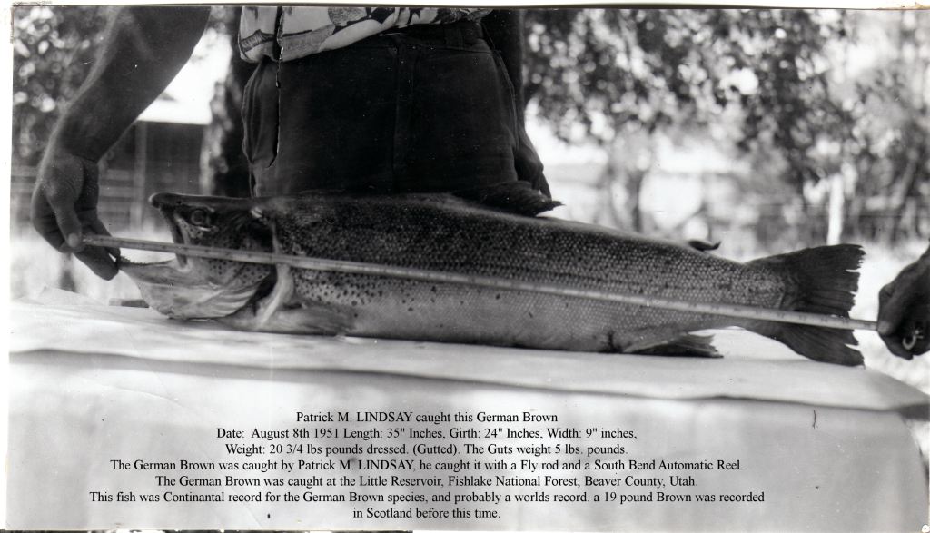 Pictured above, the fish was landed even before his father, Charles Lindsay had assembled his pole to begin the evening fishing. His father caught a 9 pounder in the “Little Reservoir” on opening day of fishing season, that year. When the big one was cleaned, it was discovered that no small fish had been recently devoured and was apparently hungry. Many witnesses got a thrill watching him bringing his large trout to the bank. They all got a thrill at seeing so large a German Brown trout landed in the “Little Reservoir” which at that time was the world record. It is beautifully mounted in the “Fishlake National Forest Service Office in Beaver, Utah” as proof and was the main attraction for years to come for fly fisherman purchasing homemade flies tied by my mother Louise Lindsay.