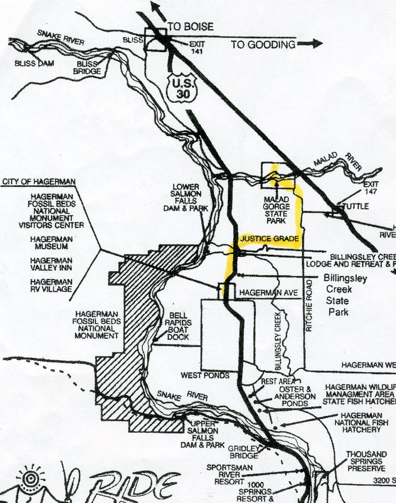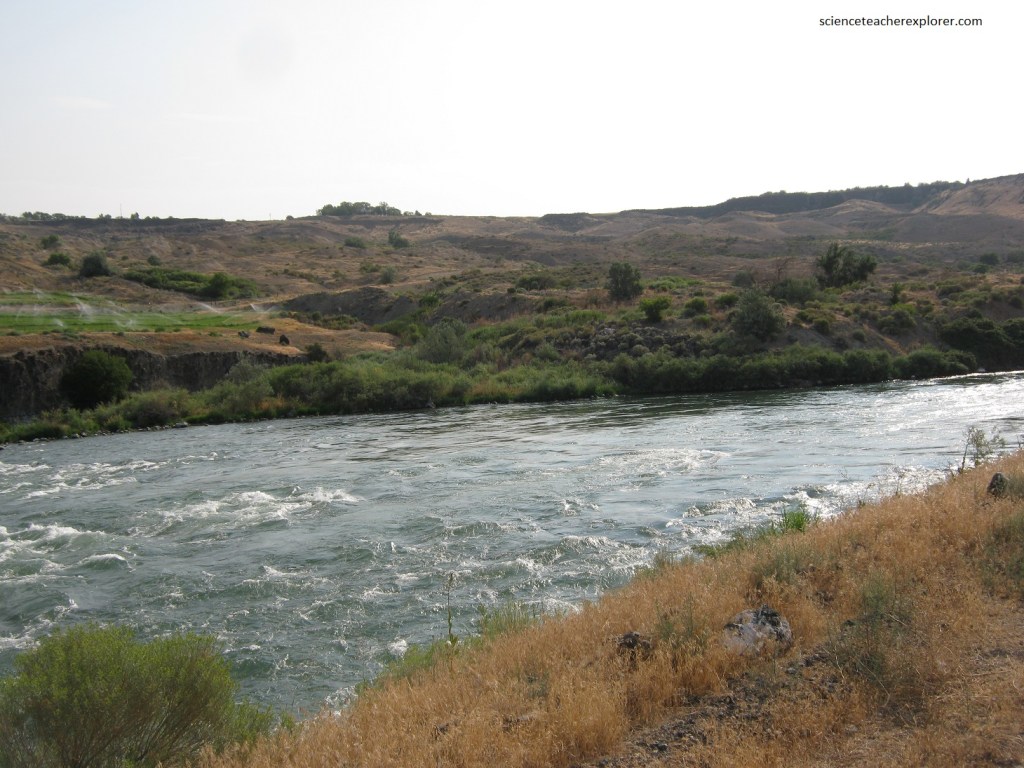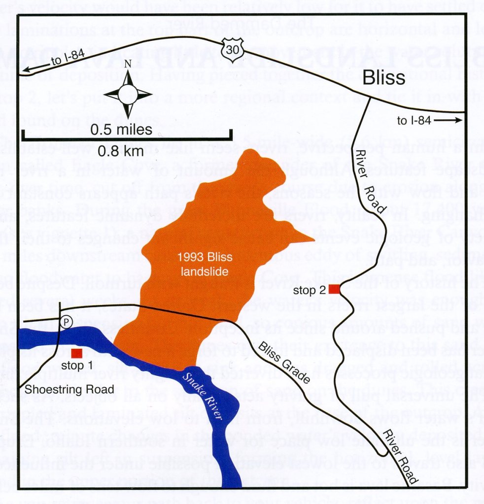 Pictured below, just south of Bliss, Idaho, the “Old Bliss Grade/River Road skirts the eastern edge of a large landslide that occurred on July 24, 1993. The 100-acre slide moved sediment and debris into the Snake River, temporarily blocking the river and displacing it several hundred feet south of its former course.