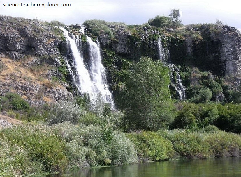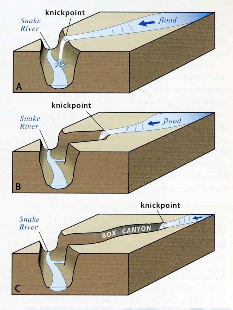 How exactly did this odd canyon form? Most box canyons similar form where springs emerging from the base of the canyon’s head is undercut by the cliff’s above. A process known as groundwater sapping. However, groundwater sapping works to lengthen the canyon if the spring undercuts loose sediments such as sand. Box Canyon is an amphitheater-shaped canyon carved from hard basalt. Therefore, the accepted theory is now about floodwater pouring over the rim of the Snake River Canyon forming a waterfall. Erosion at a knickpoint of a waterfall moves upstream as it erodes the lip of the falls and removing bedrock, (imaged below). Of course you would need a flood to accomplish this.