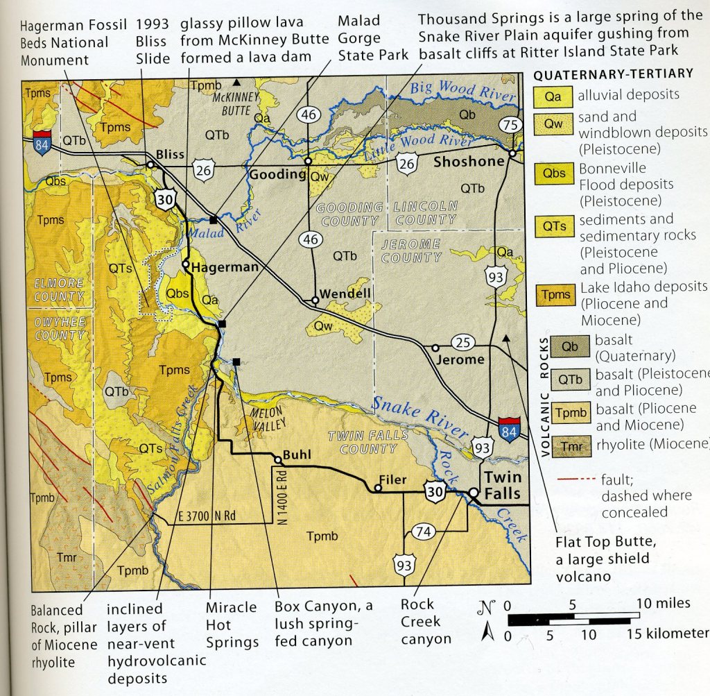 The geology of the area was a major contributing factor of the above landslide. About 52,000 years ago, lava erupted from McKinney Butte, a local shield volcano, and traveled downhill to the rim of the Snake River Canyon near Bliss. The lava spilled over the edge and into the river, forming a dam of lava, (Pictured below).