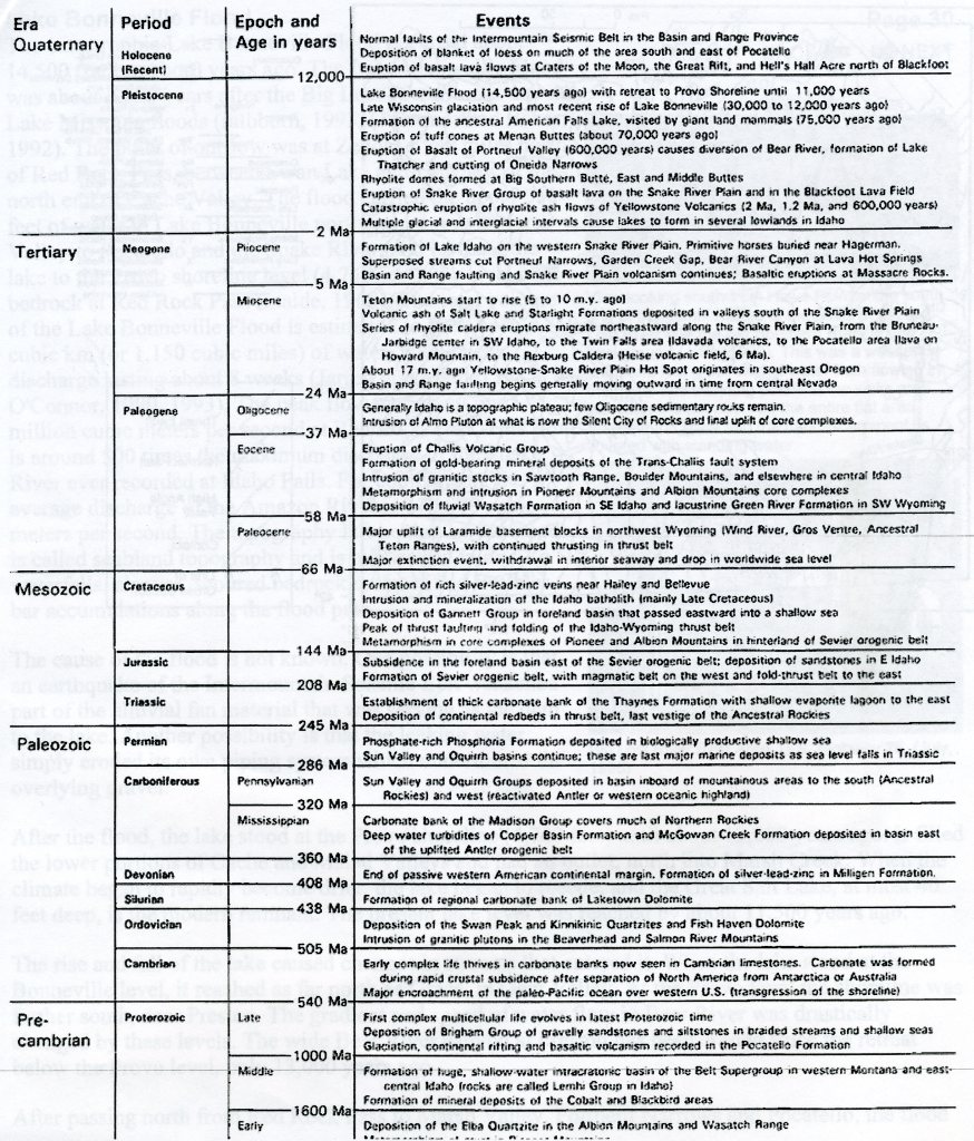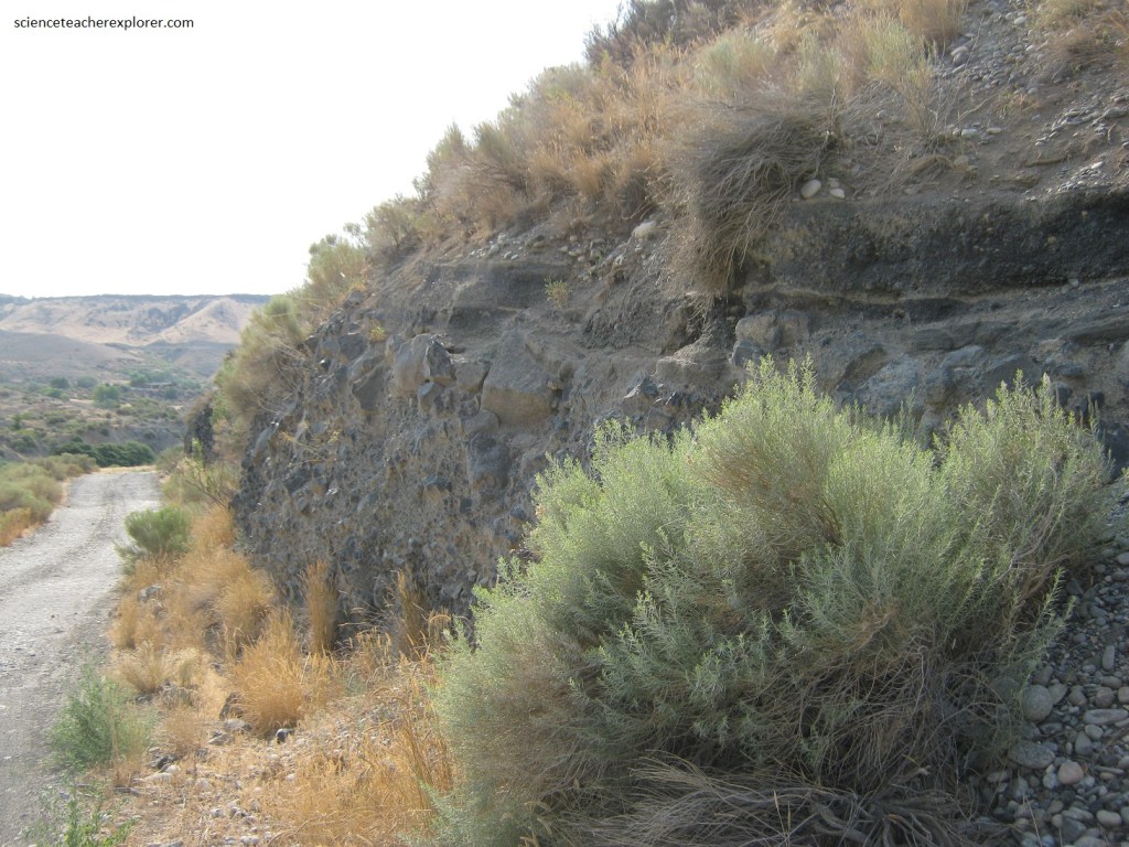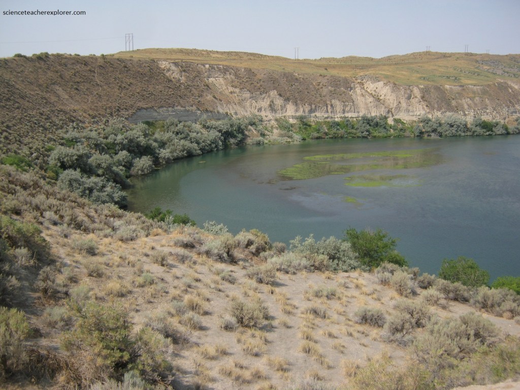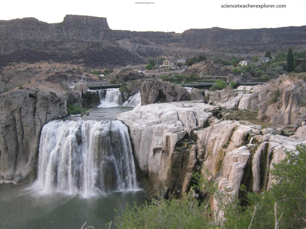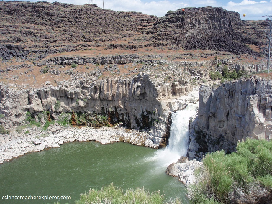 The canyon of the Snake River exposes Miocene (6.3 million year old) rhyolite underneath the cover of the 5 million year old basalt lava. Pictured below, at Shoshone Falls the Snake River cascades over this rhyolite in a waterfall carved during the catastrophic Lake Bonneville Flood about 14,500 years ago. Shoshone Falls is 70 meters high, higher than Niagara. When this picture was taken, during the late summer, the falls is reduced to a trickle due to the river’s impoundment by upstream reservoirs that store water for irrigation.
