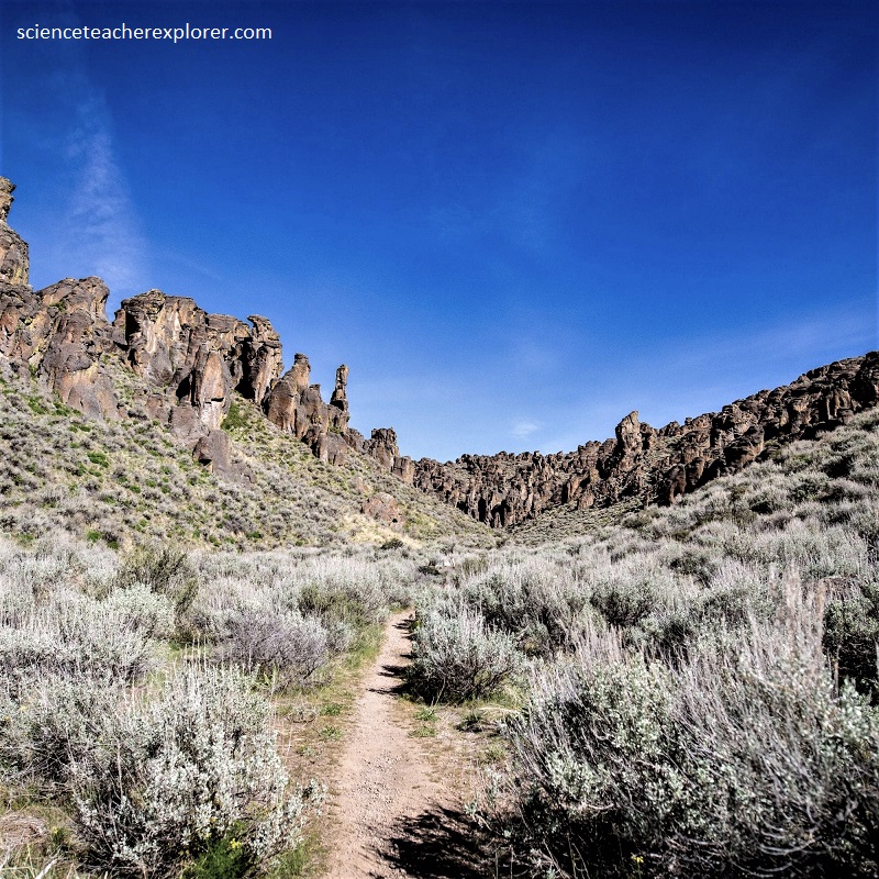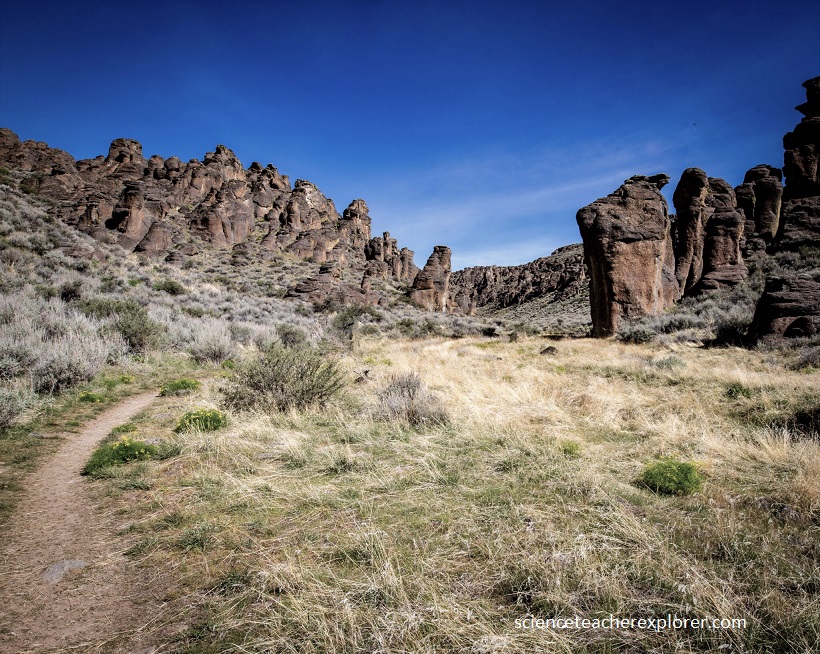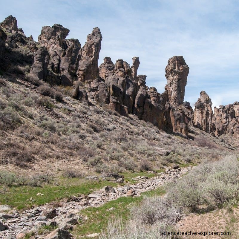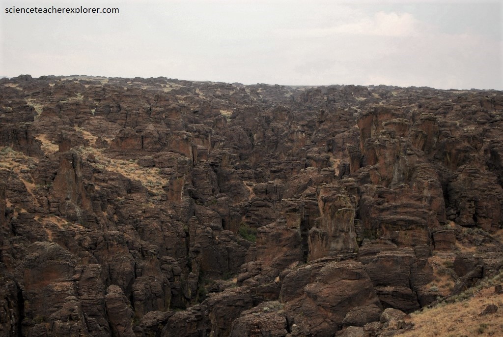 Pictured above, the Gooding City of Rocks developed in rhyolitic tuff that has been preferentially eroded along vertical fractures. The rock erupted about 9 million years ago when the Yellowstone hot-spot was centered under the central Snake River Plain rather than it’s present location under Yellowstone National Park.