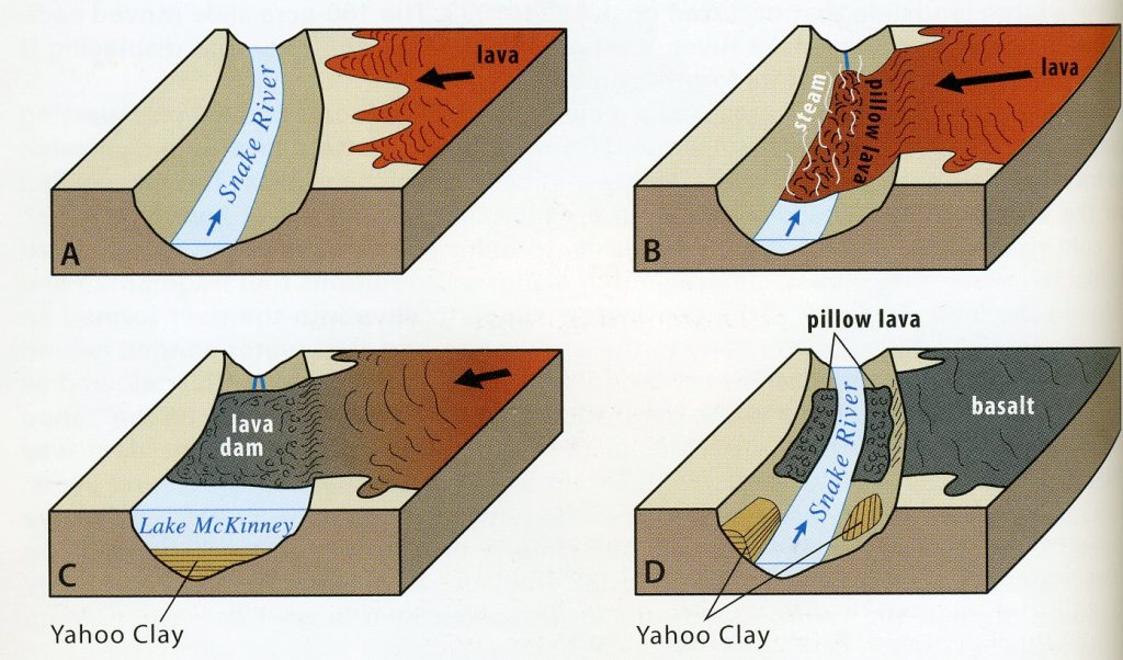 During the Lake McKinney phase, sediment carried in suspension by the Snake River slowed as it entered the calm water above the dam, allowing clay, known formerly as the “Yahoo Clay”, to drop and settle to the bottom of the lake. South of Bliss, Idaho; the Yahoo Clay forms an extensive layer draped over the existing canyon walls north of the Snake River, (pictured below).