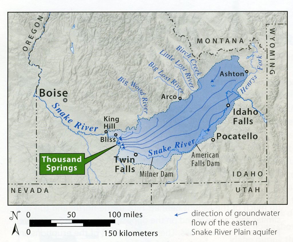The Snake River aquifer is a complex system, with multiple layers of high permeability. It discharges 8 million acre feet of water per year in the famous Thousand Springs area on the north wall of the Snake River canyon from Twin Falls to Hagerman. Most of the commercially produced trout in the United States are grown there.