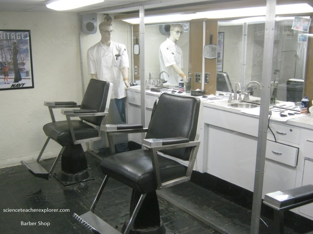 Pictured above, the room with three chairs was used for enlisted men. The ship’s barbers were men selected from the crew. They were trained and held the rank of ordinary seaman barber and worked under a chief barber.