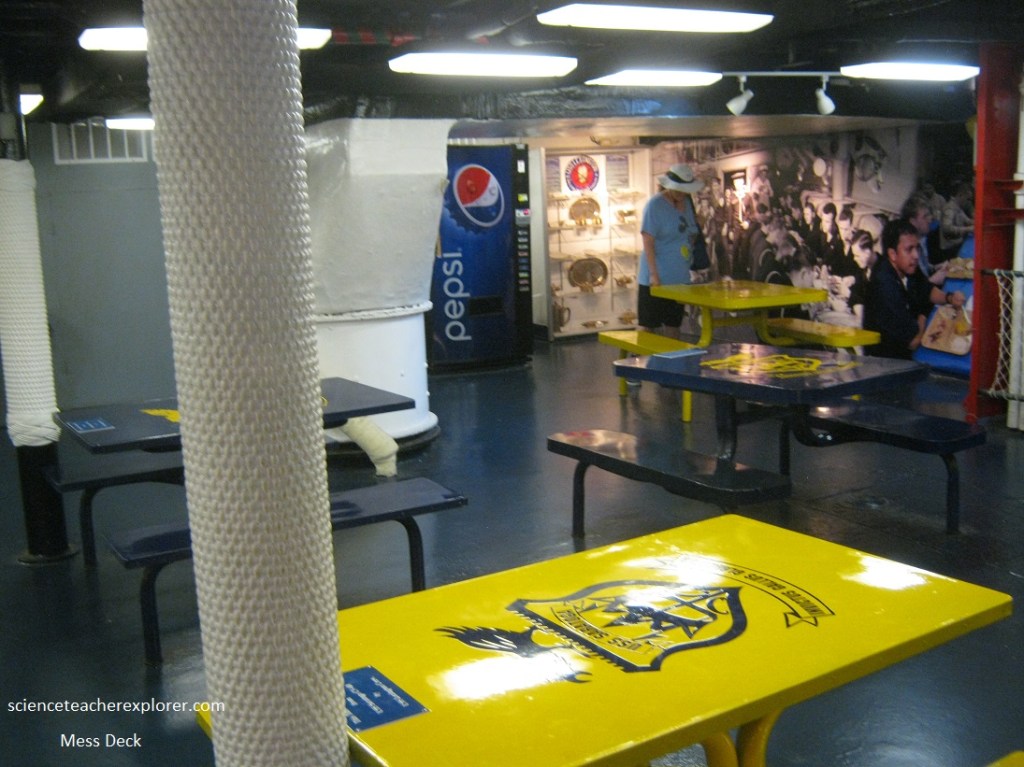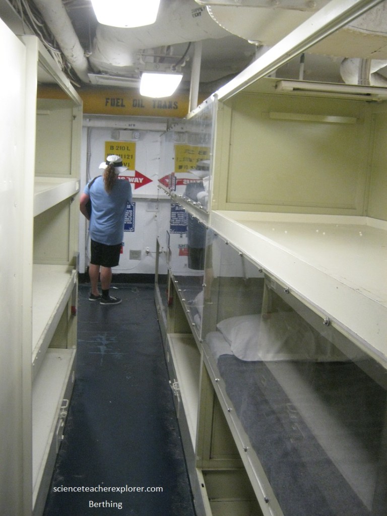 Pictured above, Becky is wondering around the dining area of deck 3 where the crew of enlisted men and women brought their meals from the mess line. The galley operated 24/7, and all departments were assigned different time slots for meals; therefore dining was done in orderly fashion. Also on the mess deck was a “Geedunck Stand”, which served soft drinks, ice cream and candy.