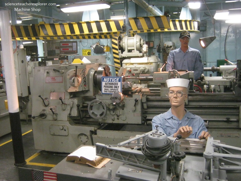 Pictured above is a 1,240 square-foot machine shop. A ship at sea for long periods of time must have the capability of making repairs. Compound that with a ship that carries aircraft, and an extensive repair shop is needed. Machinery Repairman often solved repair problems by fabricating new parts and did so with the equipment seen here. Equipment includes an engine lathe, pedestal grinder, radial arm drill press, vertical milling machine, bench grinder, drill press, dynamic balancing machine, horizontal milling machine, pantograph and a power hacksaw.