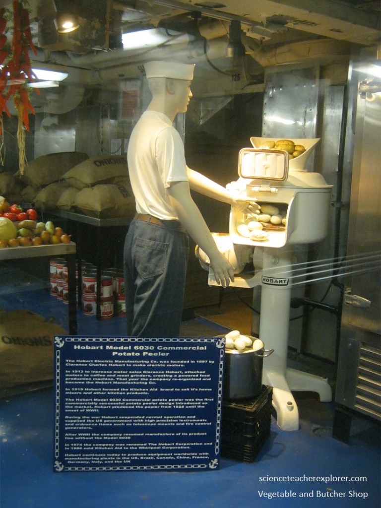 Pictured above, the daily requirements of raw vegetables and meats needed in the galley to prepare the recipes of the day came from these rooms. Raw vegetables and fruits were scrubbed, washed, and peeled, based on what the produce was to be used for, such as in soup or as a cold salad. Cuts of meat were butchered from large carcasses and the meat was sliced, cubed or ground to the specifications of the recipe it was to be used in.