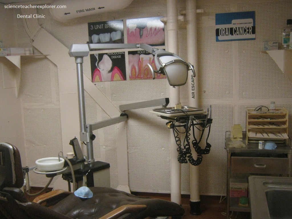 Pictured above, the USS Lexington had a fully-equipped, very extensive dental department. It was staffed by 2 dentists and 7 technicians. There are 3 examination/procedure rooms, an X-ray room and of course, the waiting room. Nearly every type of dental procedure could be performed on board, from routine cleanings to fillings, extractions and more.