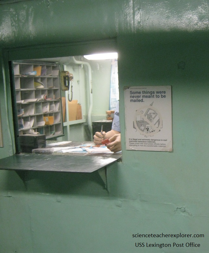 Picture above is the window to the Post Office. Postal Clerks manned the post office and sorted mail by department, then by person. A designated person from each department went to the mail room and picked up the mail for his/her crewmates. The announcement “Mail Call” was made and crew went to their designated place on the ship where they waited for their name to be called to collect their mail. The US mail was delivered by tanker, supply ships or dropped by aircraft about every three weeks.