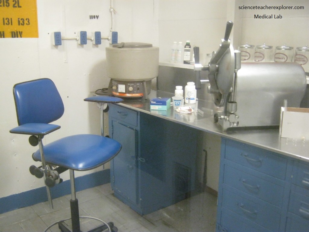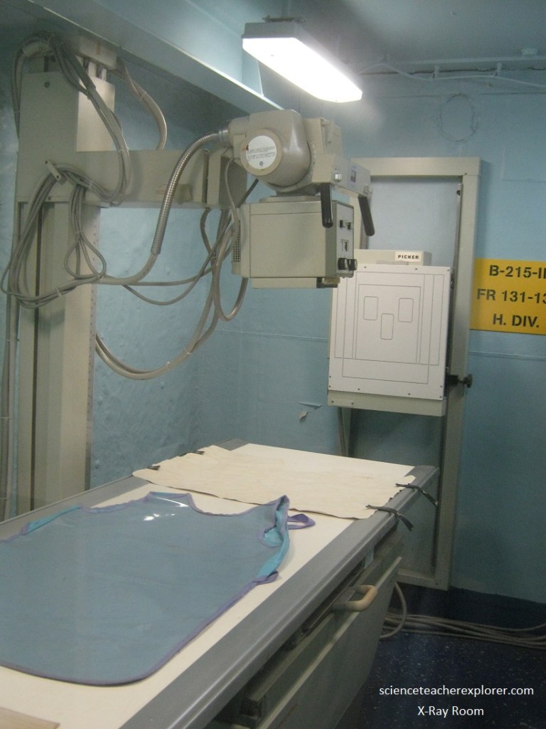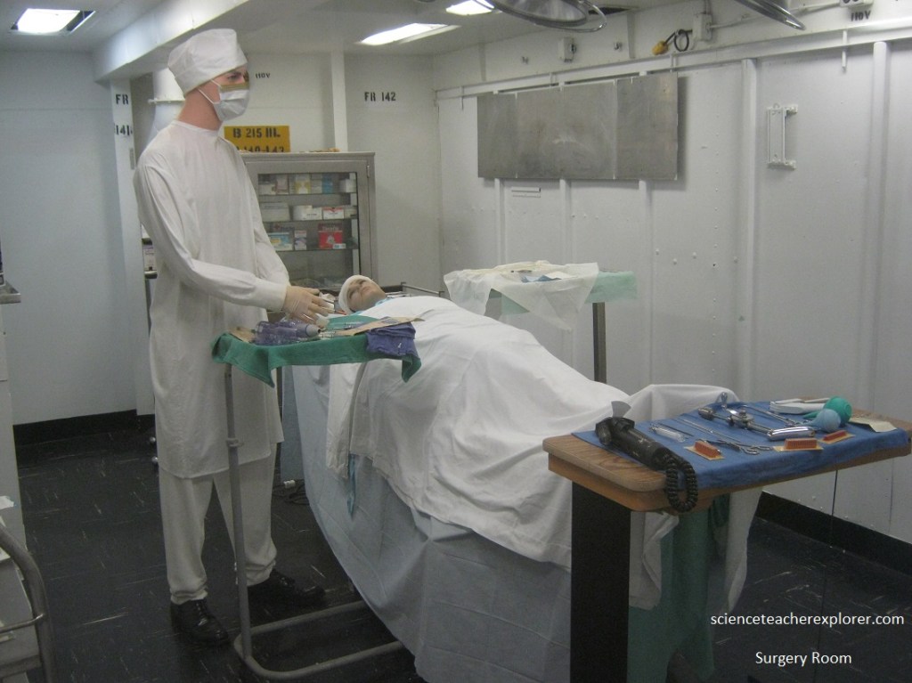 Pictured above, the photo shows the Triage or Surgery Room, in which everything from treating minor cuts to major non-invasive procedures could be performed. The room could also function as a full-scale surgical room if needed. The bulkheads (walls) and overhead (ceiling) are designed for quick and effective cleaning and sterilizing for major surgical procedures.