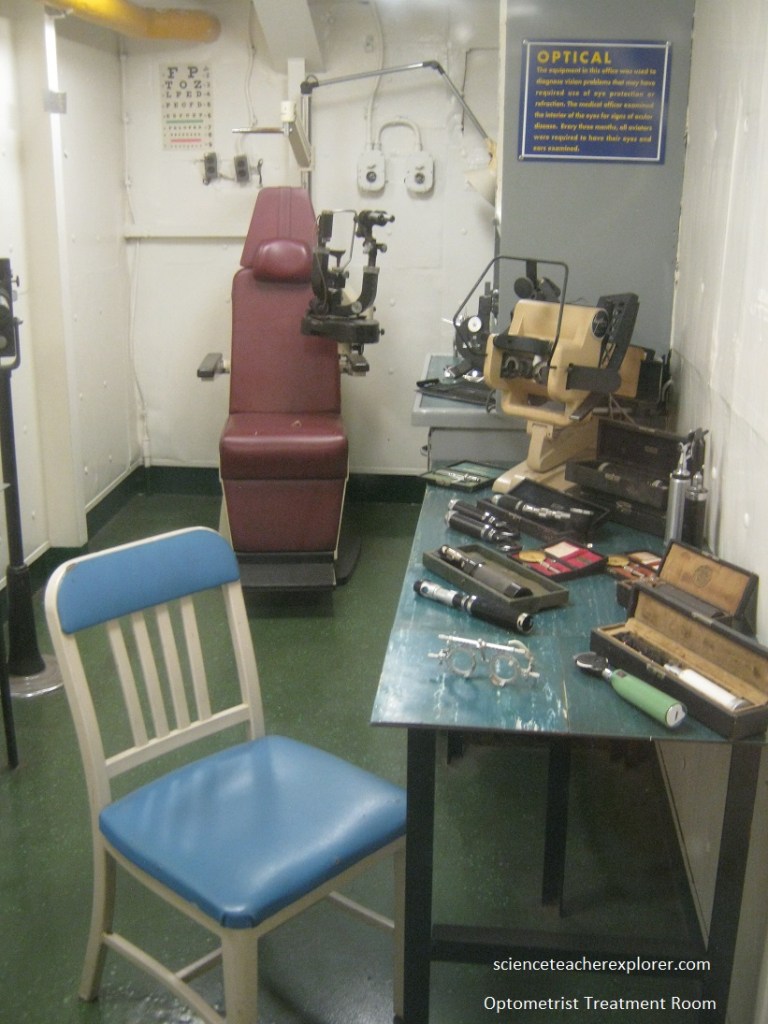 Pictured above, is the Doctor’s Examination room. The doctor’s office has a connecting head (lavatory). Doctors aboard US Navy ships were called “Flight Surgeons” and were qualified to take care of all the needs of the ship’s hospital.