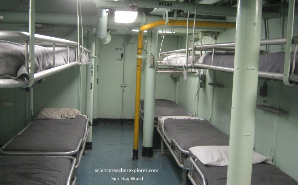 Pictured above, injured or ill personnel who were not contagious stayed in the Sick Bay Ward until they were well enough to return to their own berth (bed).