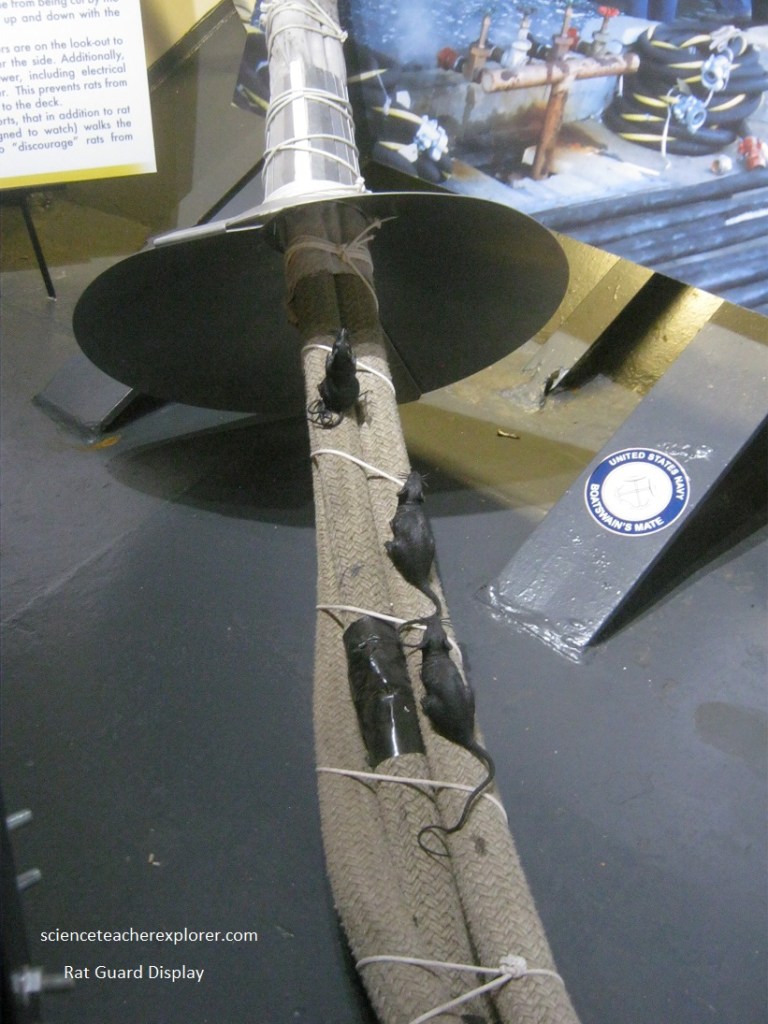 Pictured above, keeping mice and rats from entering ships is important task. Rodents will gnaw on electrical insulation which can cause electrical shorts, outages, or fires. They also get into food stores. The most effective tool to keep rodents off of the vessels are rat guards. These are round disks that fit over tending lines that prevent the rodents from climbing up to the ship.