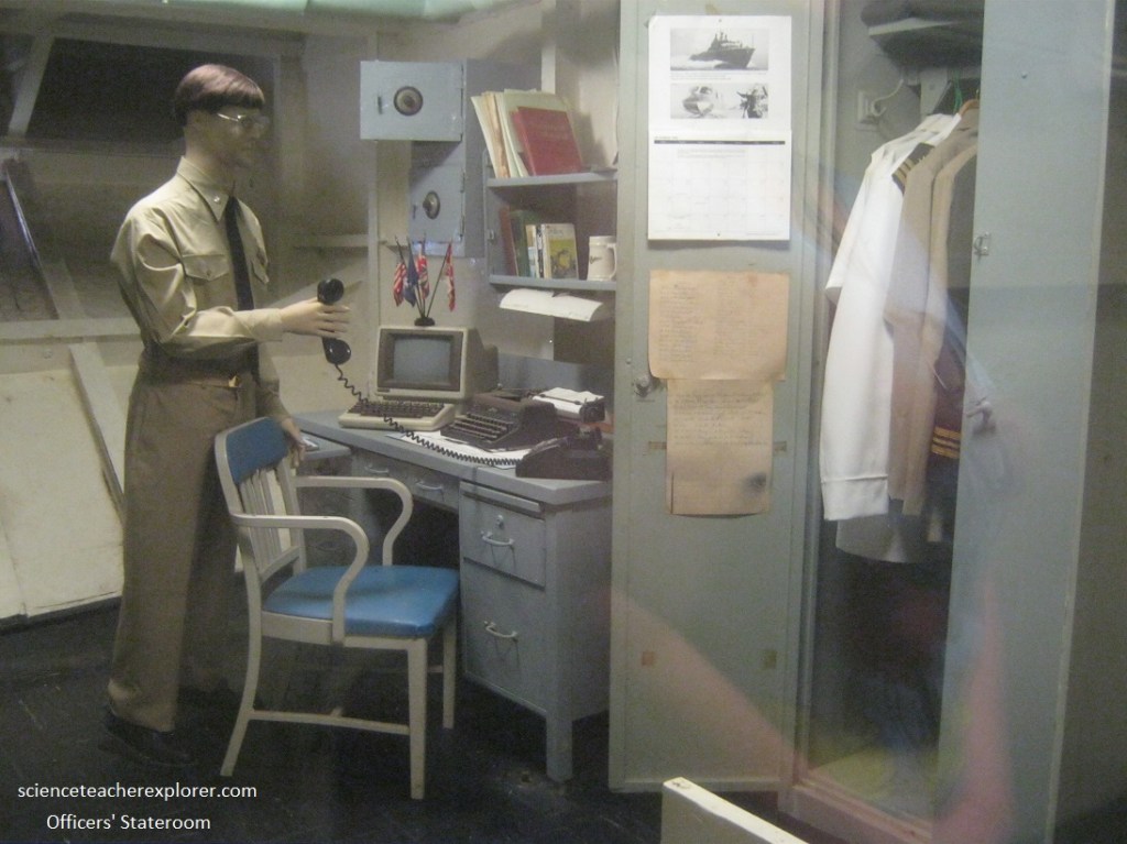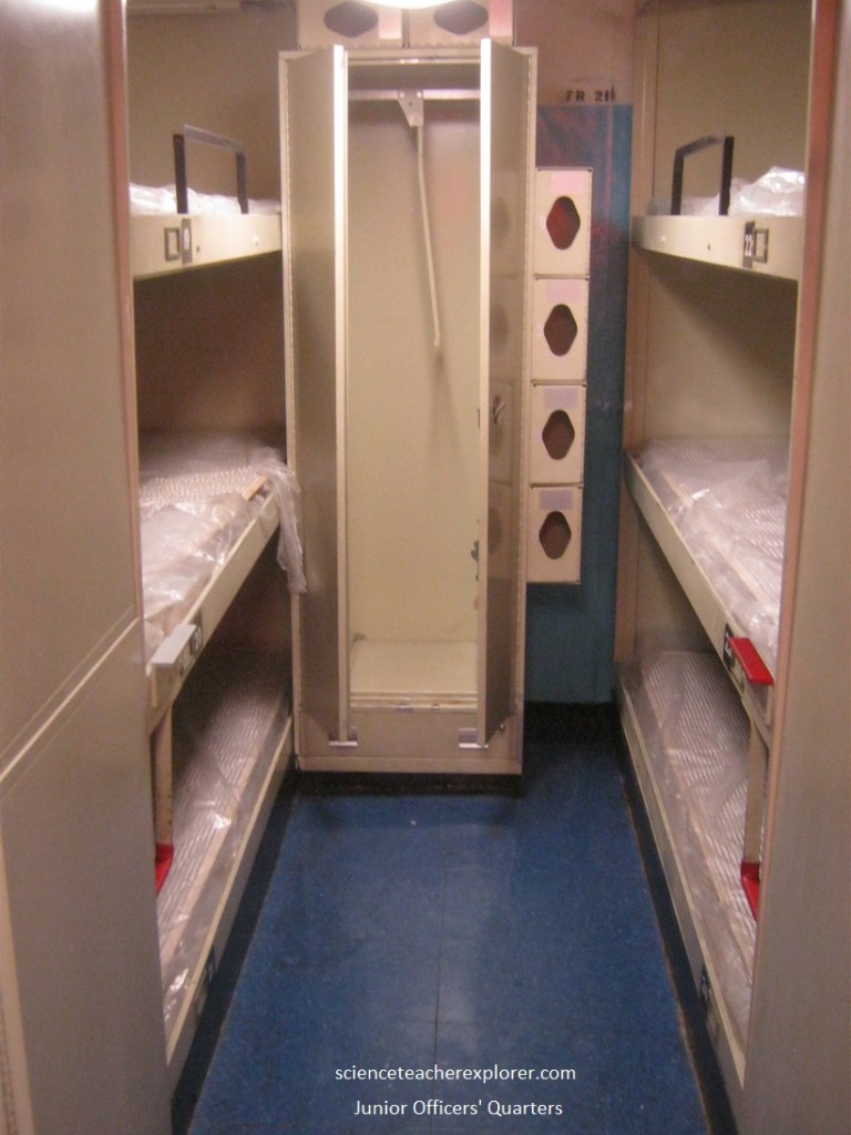 Pictured above, often referred to as “Boys Town,” this area was occupied by ensigns (commissioned naval officers of the lowest rank), and junior officers on temporary assignment. Their lounge has a gameboard to pass the time away. The bunks, known as racks, were divided by alleys. In addition to their bed and lockers, they had a fold-down desk.
