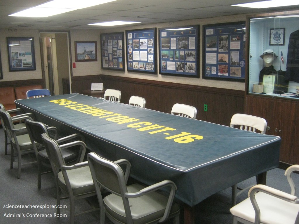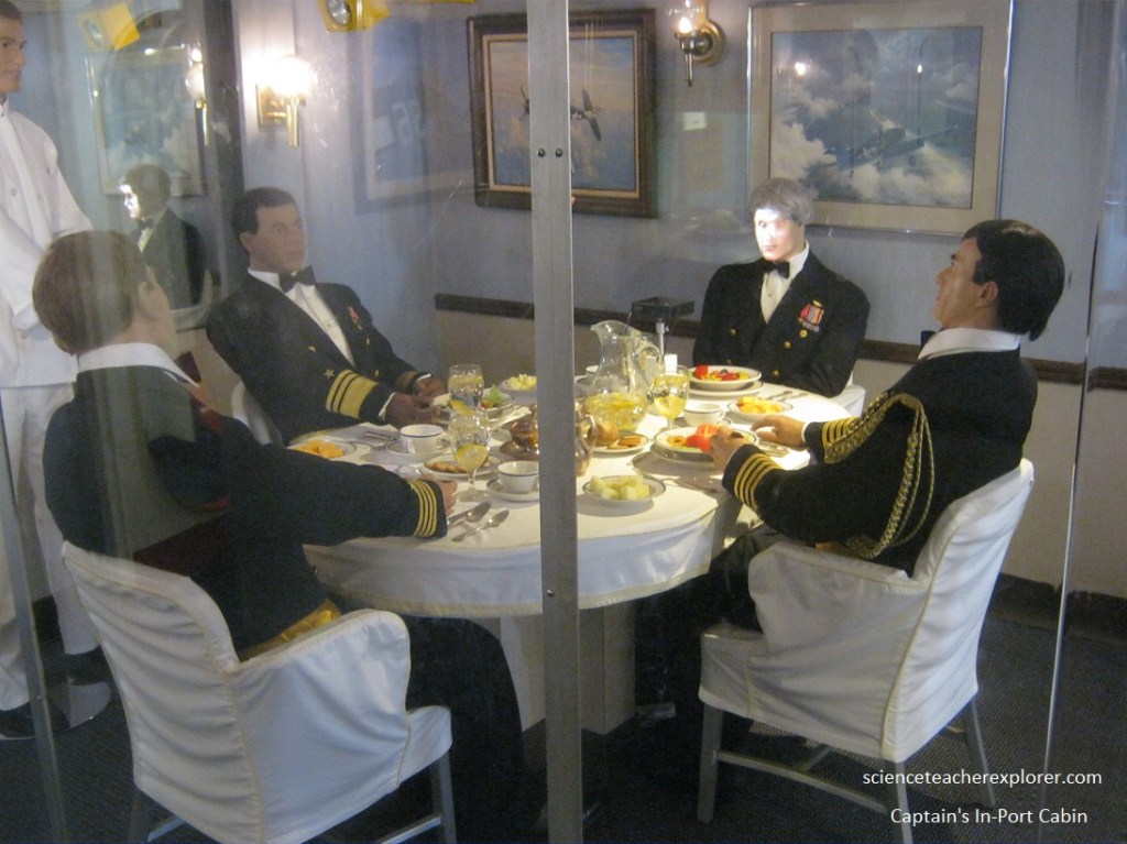 Picture above, the Admiral’s dining room was also used for conferences and entertaining VIPs. The color of the table and chair coverings indicated the purpose of the meeting to be held in this room: white (dining), blue (meetings), & green (mast).