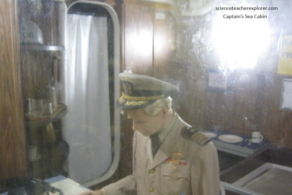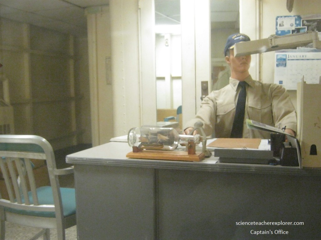Pictured above, from 1943-1991, thirty-three captains made this tiny room their home while at sea. The cabin features a chair, a small desk, a small safe, a closet, an oscillating fan, a bed and a head (bathroom) with a shower. Notice that the bed has a raised “freeboard” to keep the captain from rolling out of bed in rough weather. The cabin is located just aft of the pilothouse and bridge, enabling the captain to be at the bridge within seconds if need be.