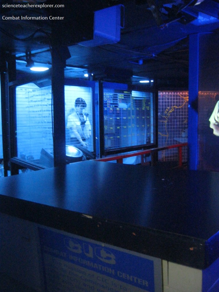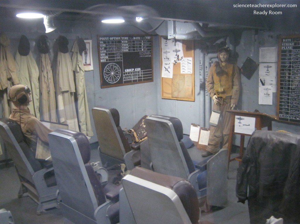 Pictured above, the Ready Room served as a briefing area for the pilots and air crew prior to a mission. Because our naval pilots made carriers the dominant naval weapon of WWII, these rooms were designed for their orders to launch their planes, they could nap in the padded recliners, read, play cards and in general, just relax in air-conditioned comfort.