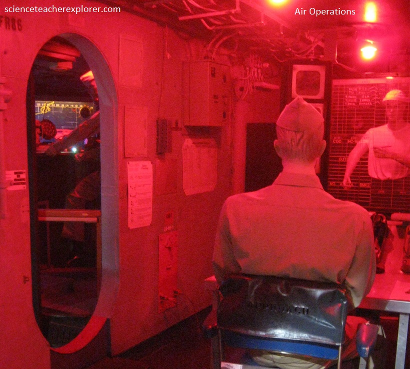 Air Ops is where planning and coordination for flight operations on the carrier were made. Close contact was required with the Air Boss, Carrier Air Traffic Control Center, Combat Information Center, the flight deck, hanger controls, squadron ready rooms and maintenance. The plot board listed all information for the day’s flying schedules: what squadrons were flying which planes, launch and return times, rescue helicopter status and other outbound traffic.