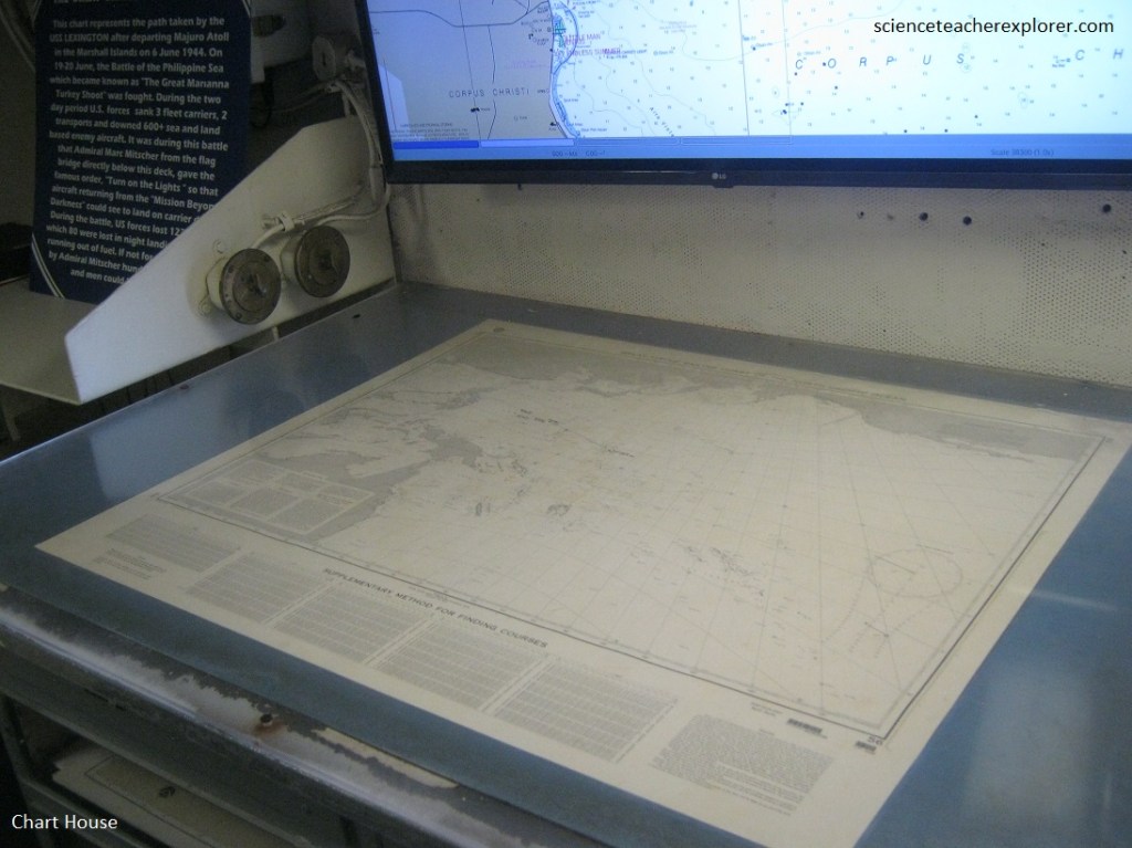 Lexington’s chart house is just aft of the pilothouse on the same deck. The ship’s navigator and a team of quartermasters did much of their work here. The navigational team kept a constant plot of the ship’s position at any given moment as well as a plan of where the ship was going. Tools of their trade included navigational equipment such as sextants, stadimeters, bearing circles, stopwatches, parallel rules, dividers, protractors, position plotters, electronic devices and navigation charts and tables.