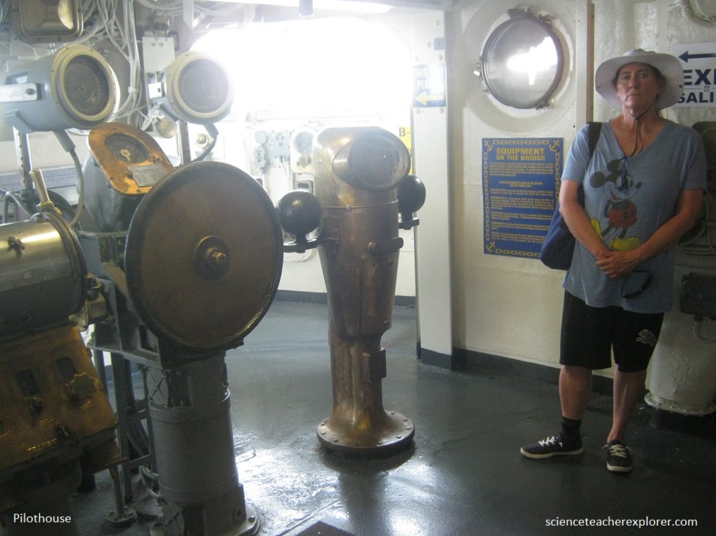 Pictured above, in this armored area are the ship’s primary instrument that control and monitor her movements and peed. During combat conditions, the portholes and watertight door were closed. The above photo shows pilothouse equipment that includes: Gyrocompass Repeaters, Rudder Angle Indicator, Engine Order Telegraph, Engine Revolution Indicator, Helm and Magnetic Compass.