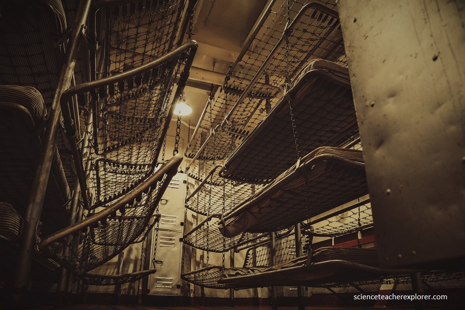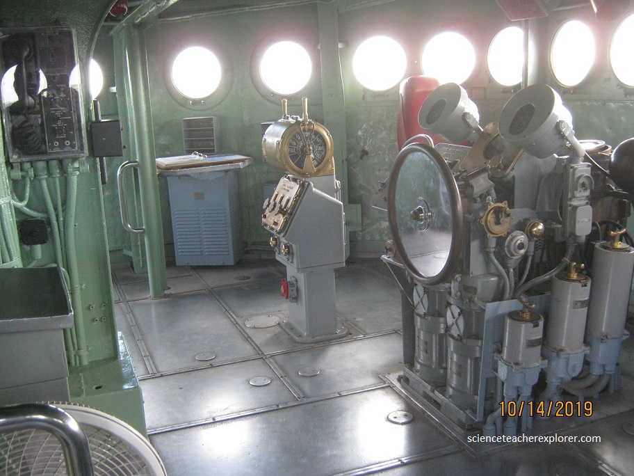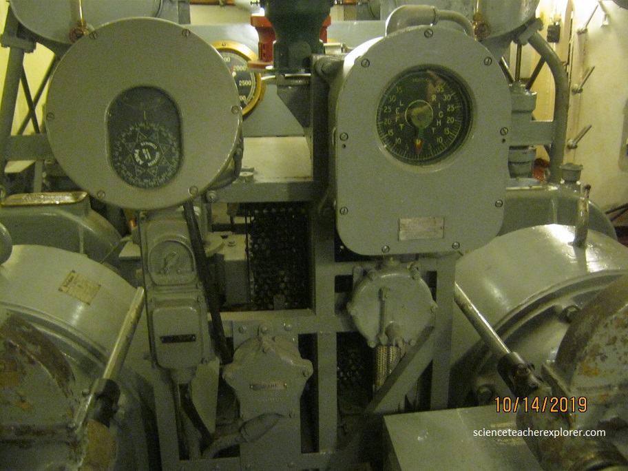 As the Ship moved through the water and turned, the spinning gyro compass would resist any changes in the ship’s course. The gyro compass would remain constant in tis measurements and, thereby, keep an accurate track of the Ship’s course changes. The gyro compass is located in the exact center of the Ship in order to lessen the amount of centrifugal force directed against the gyro compass as a result of the Ship’s roll and pitch in the water.