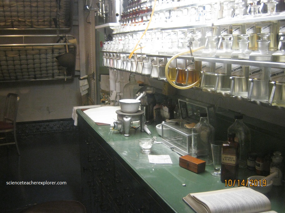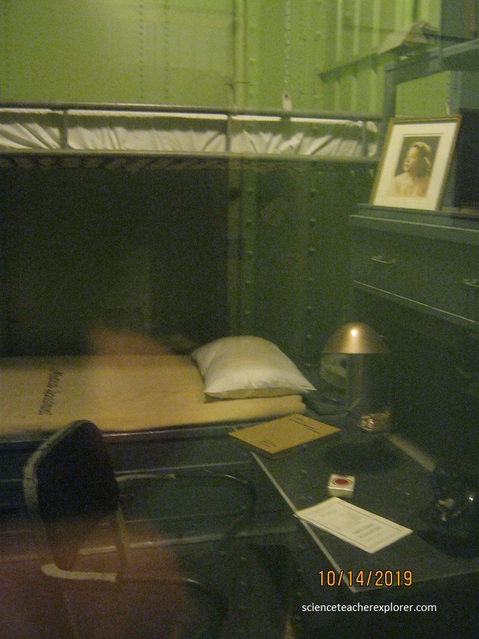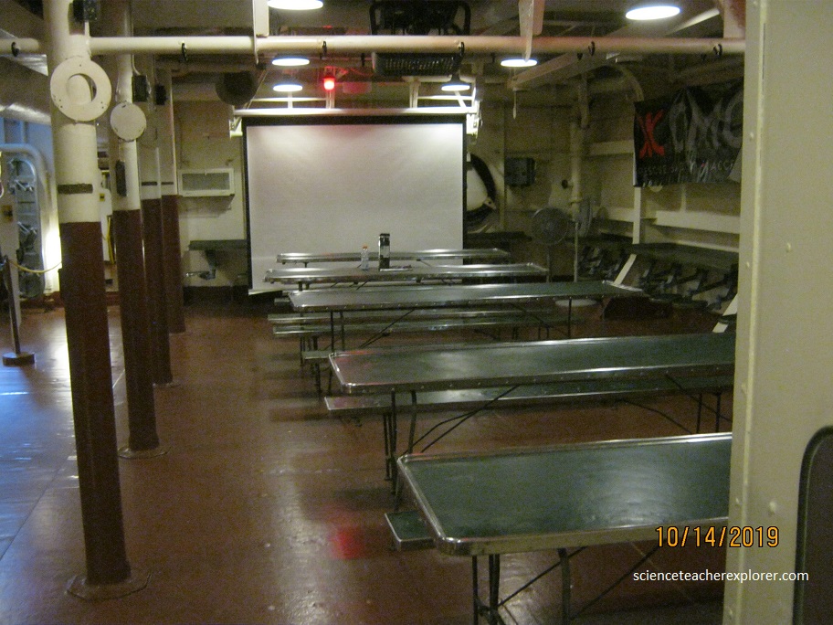 Pictured above, this compartment is called the Interior Communcations Central. It was manned by Electrician’s Mates of the Ship’s E Division. These men were responsible for monitoring, repairing, and connecting the Ship’s internal communications. In addition, (pictured above) the men were responsible for operating the gyro-compass, located in the middle of the compartment. The Electrician’s Mates that worked in this compartment would use the switch boards, seen here, to inter-connect signaling equipment with machines in other parts of the Ship, such as the Engine Rooms and the Pilot House. The switch boards also transmitted navigational information, such as wind speed, direction, Ship’s speed and course, to other parts of the Ship.
