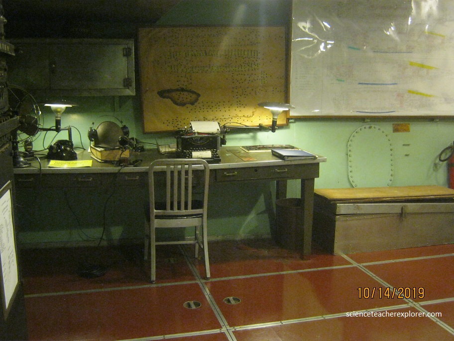 Pictured above, the men in this space directed specially trained repair teams to correct flooding, fight fires, evacuated wounded crew or reconnect damaged electrical and communication lines in combat. Normally, five enlisted men and an officer that worked in this compartment. During an emergency, the men would use the prints of the Ship on the bulkhead (wall) keeps track of damage and the actions taken to correct it. This allowed the officer in charge to maintain a complete overview of the condition of the Ship and keep the Captain informed during combat situations.