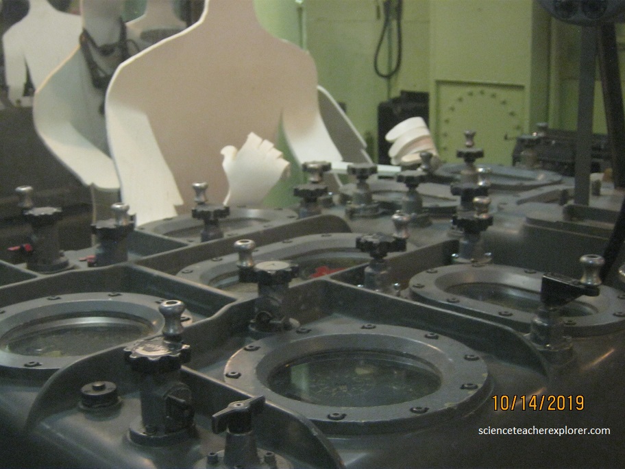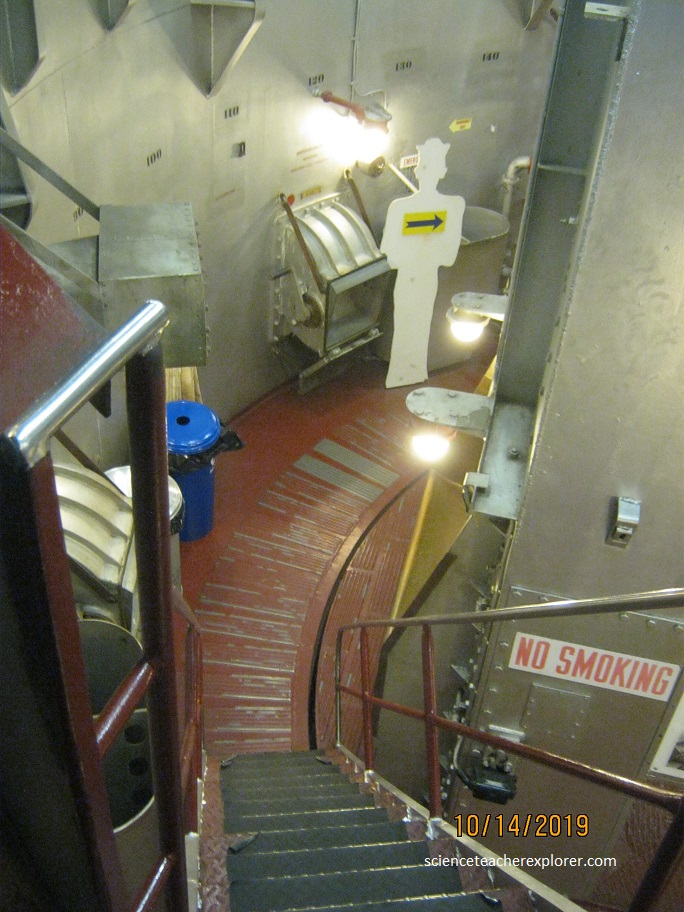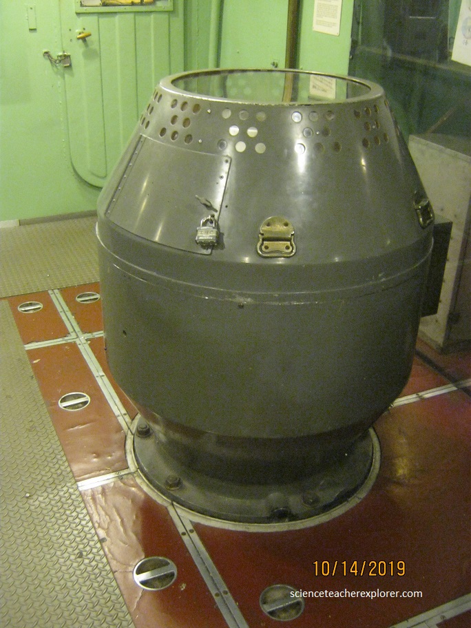 The large gray object, pictured above, is the Ship’s master gyro compass. The Ship’s master gyro compass was used to keep track of the course that the Ship was heading at any point in time. A gyro compass resembles a to top, except that the gyro compass spins constantly at a very high rate of speed making it very stable. When oriented to true north, id could determine accurately any other changes the Ship would steer. The operator in charge of the gyro compass was responsible for spinning up the gyro at least four hours before the ship was set to get underway to ensure that it was stable.