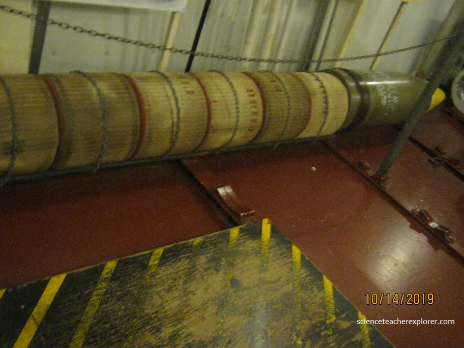 Called the powder flats by the men, the area pictured above, houses the three powder hoists which lifted powder bags up five levels to the turrets’ three gun barrels. Note that the bags pictured above were filled the black powder.
