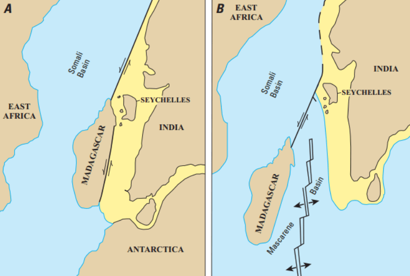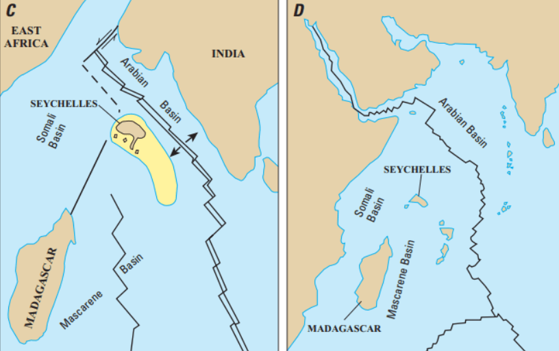 According to Geophsiists, the Seychelles Islands then underwent two more stages of rifting to isolate it from Madagascar and India. Imaged above, between 84 and 95 million years ago, rifting separated Seychelles/India from Madagascar. An initial period of transform rifting moved the Seychelles/India block northward. Around 84 million years ago, oceanic crust started to form in the Mascarene Bain, causing a rotation of the Seychelles/India land mass. This continued until 66 million years ago when new rifting severed the Seychelles from India, forming the Arabian Basin and the currently active Carlsberg Ridge, (imaged below).