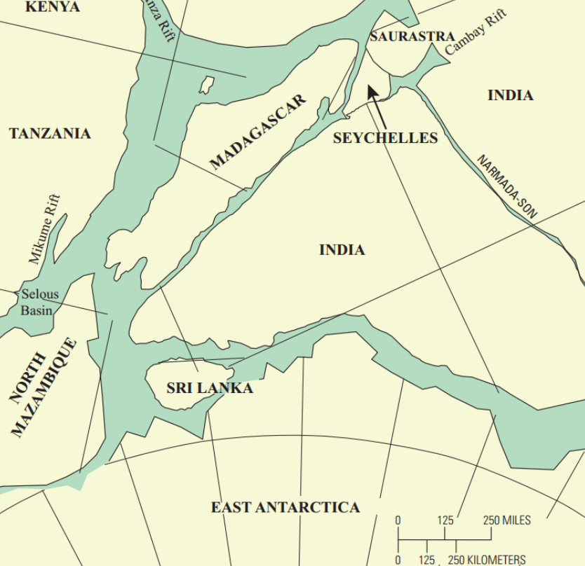 The rift jump coincided with the maximum output of the Deccan Traps and granitic-volcanics found on the Seychelles Plateau.
