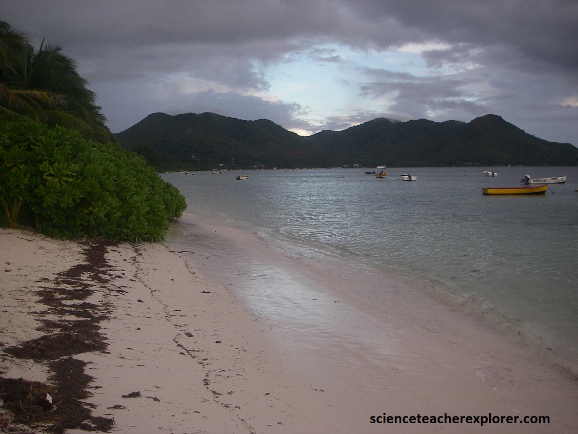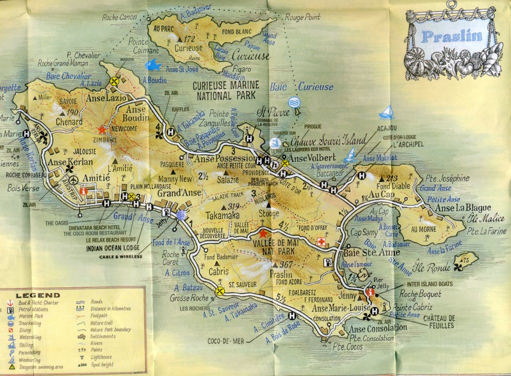 Pictured below, lying bout 45km northeast of Mahé, Praslin is a granite island, with pristine beaches and a ridge of small mountains running east-west along the center, and the svelte interior, especially the Vallee de Mai. is fascinating for its flora and birdlife.