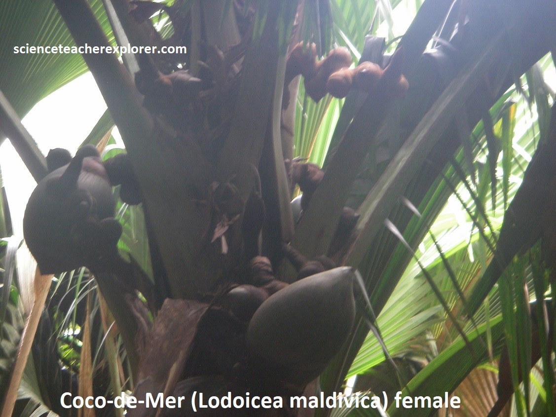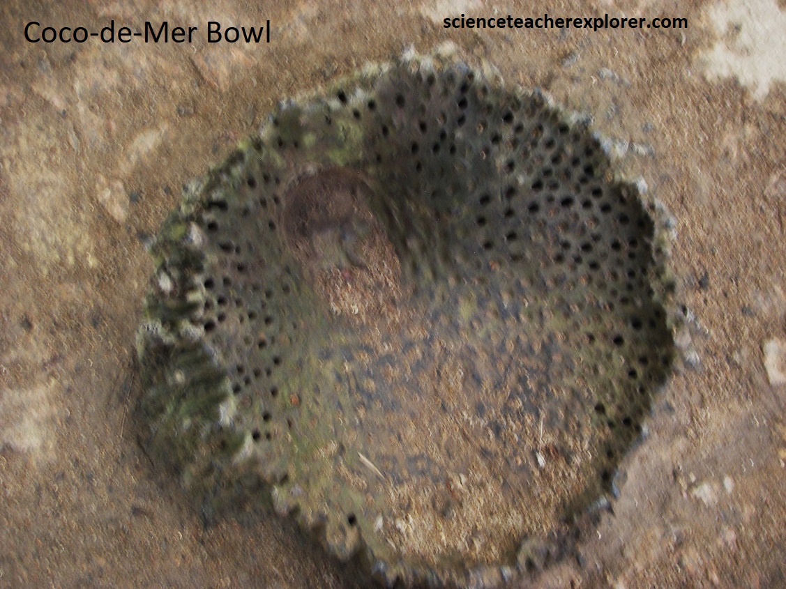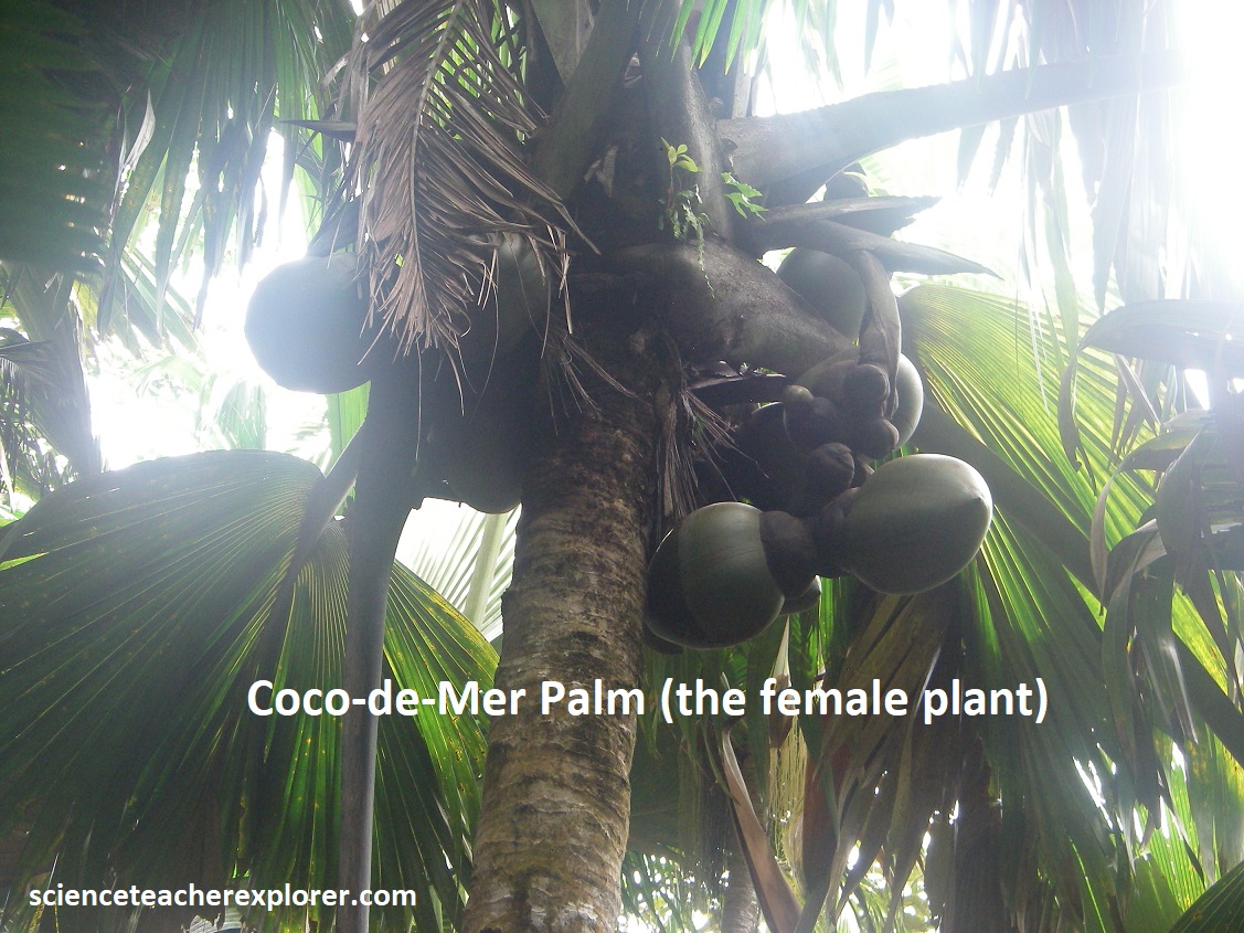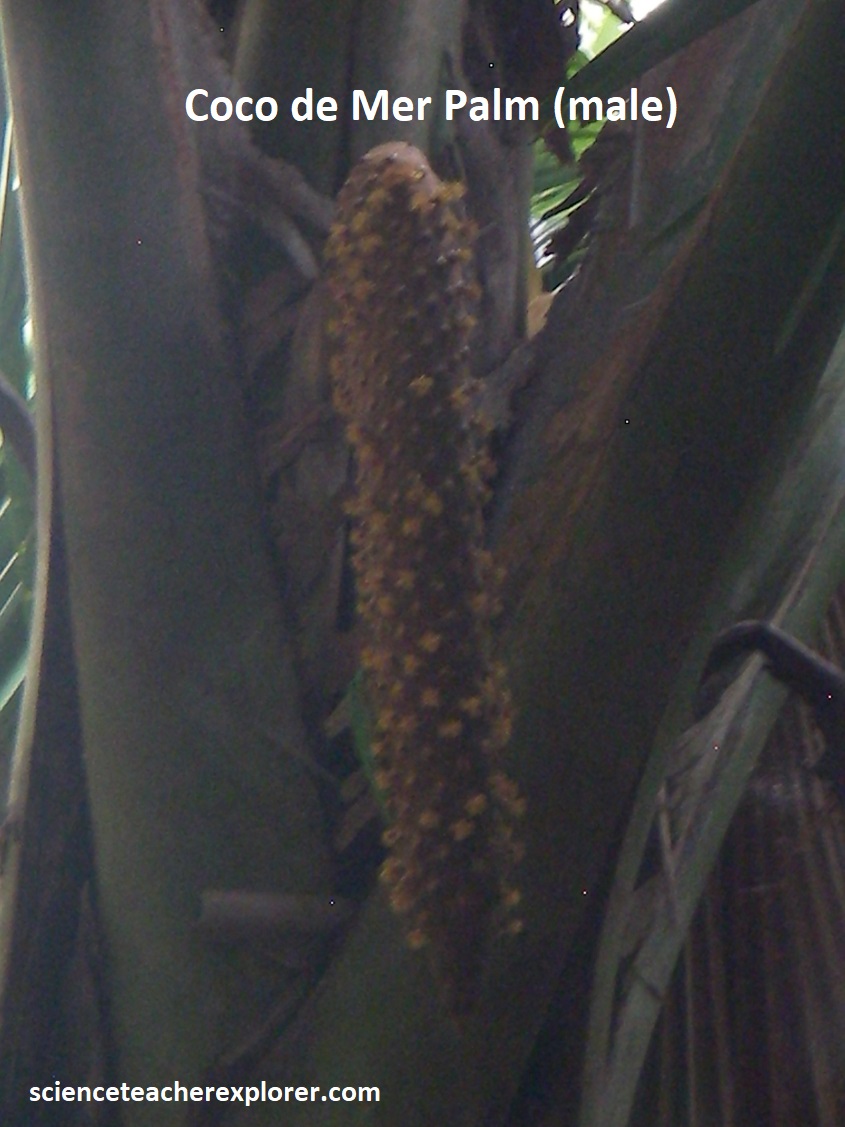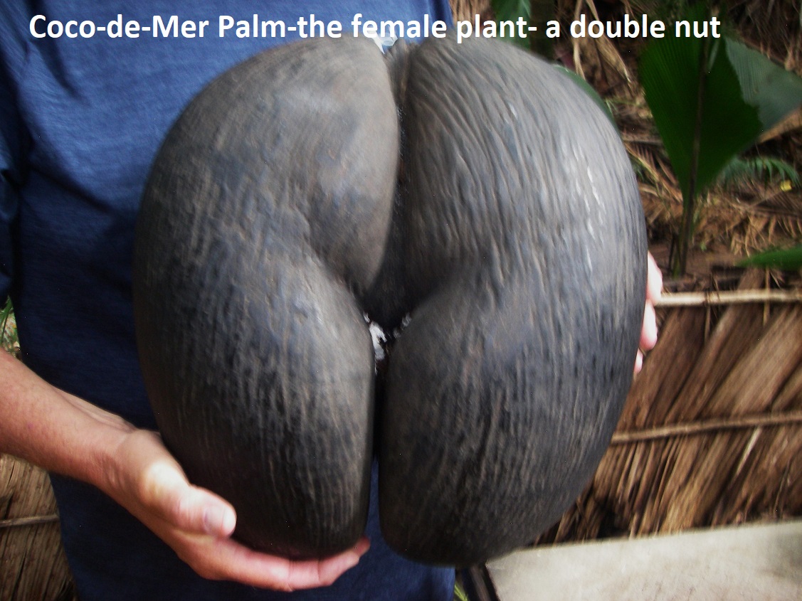 V. The Coco-de-Mer Palm (Lodoicea maldivica) is without doubt the palm of the Vallee-de-Mai and the most famous of them all. This tree produces a double nut, the largest in the world, shaped like a female pelvis. The spike-shaped male inflorescence is also highly suggestive. A single nut can weigh 18kg and take 10 years to germinate. The Coco-de-mer is a very slow growing palm with a complicated life cycle. It can mature as early as 15 years, but usually between 20-30 years. The leaf also holds the record for the world’s largest at 3.3 square meters in size. Until the Valle-de-Mai was found, people beyond the Seychelles thought the strange nuts came from the bottom of the sea, (hence, the French name meaning “sea coconut”. Mature palms can grow to over 25m tall. Male and female parts occur on separate plants. The male catkins contain lots of pollen, providing a food source for animals. At the base of a Coco-de-Mer palm is an extremely dense and durable “bowl” which is punctured by numerous finger-sized holes, and resembles a huge collander. The bowl forms a socket, into which tits the bulbous base of the trunk. The tough, flexible, rop-like roots pass through the holes in the bowl, anchoring the palm to the ground. It is thought that this arrangement allows an certain amount of movement of the trunk in strong winds, for the trunk itself is inflexible and cannot bend in the wind like other palms. {Dead standing Coco-de-Mer trunks slowly decay and are the favored nesting site of the Seychelles black parrot.